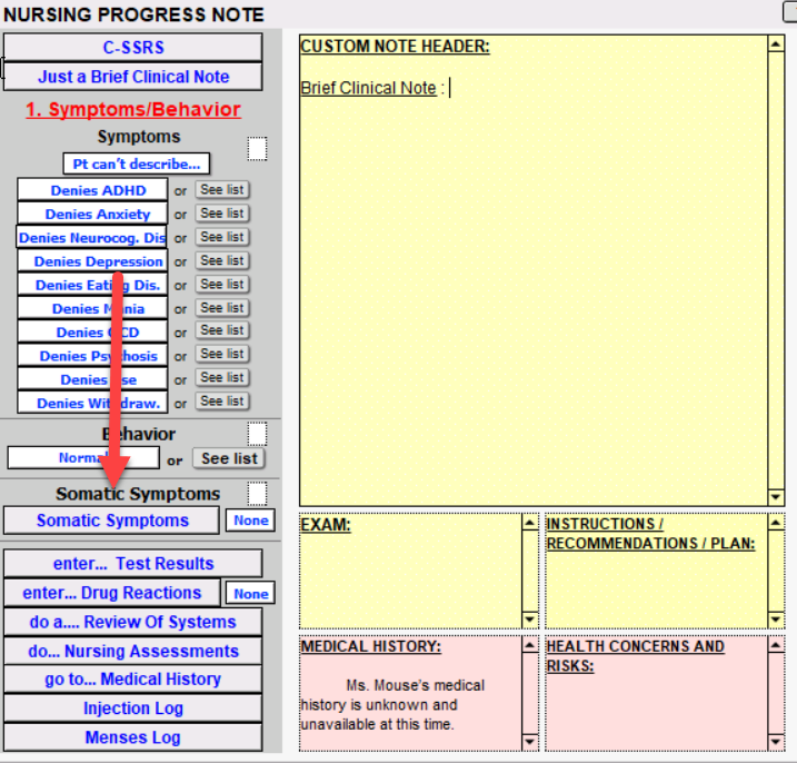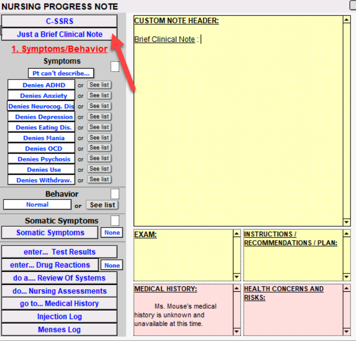 Clicking the Just a Brief Clinical Note button will add a subtitle to the yellow field. You are able to add a brief note for the patient.