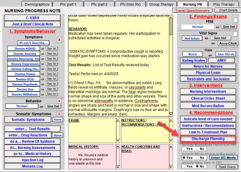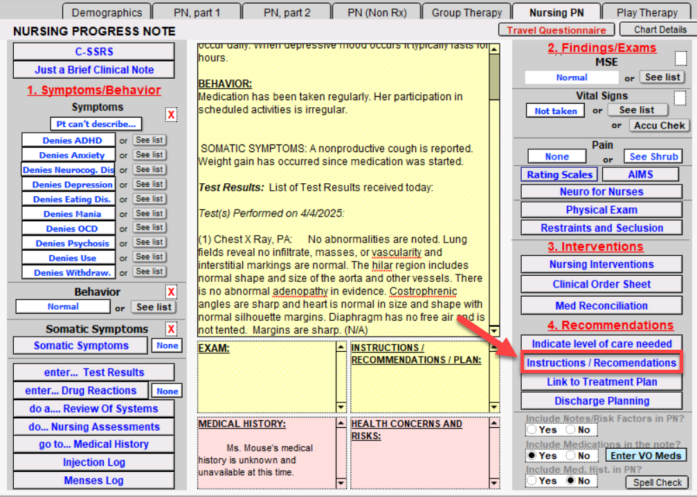 Select the Instructions/Recommendations button to see choices built into the program. The buttons on the left side of the screen are pre-programmed and offer options appropriate to both inpatient and outpatient settings.
