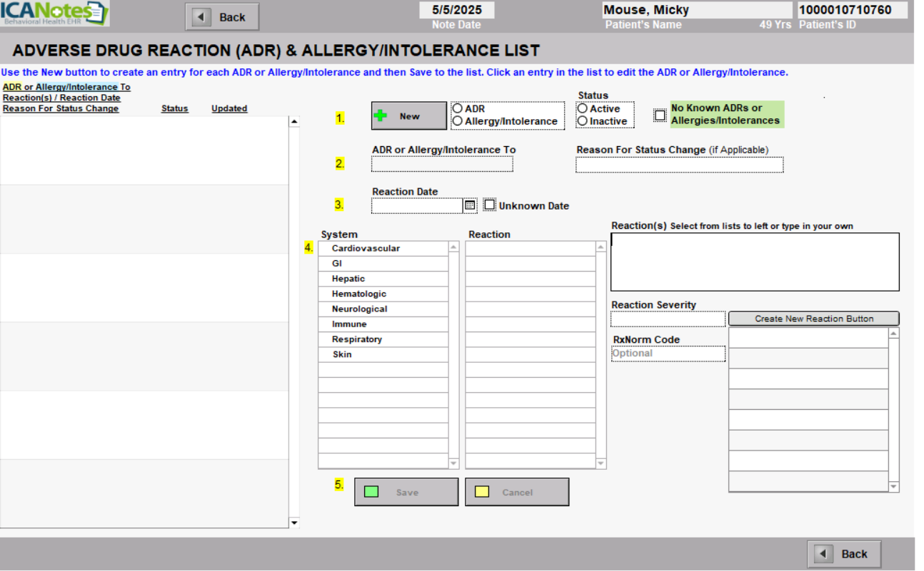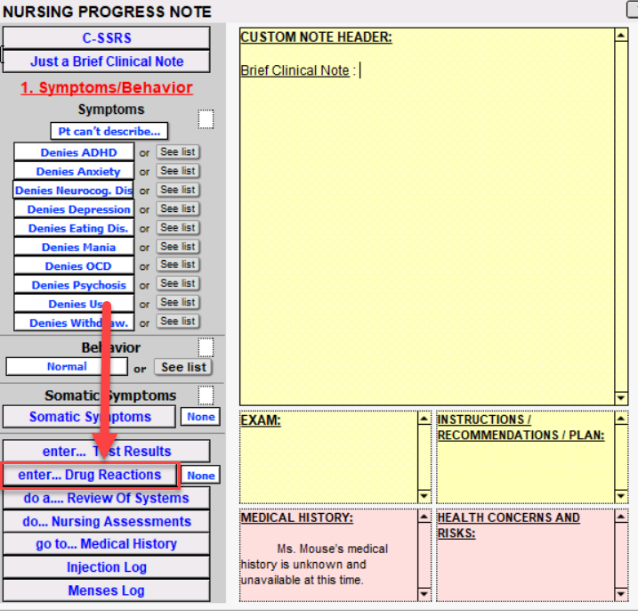 We click on the enter... Drug Reactions button to document a variety of side eects associated with medications. Click the Drug Reactions button to document any allergies that the patient may have. If no adverse drug reactions are reported, you can click on None. Once done documenting, don't forget to click Save and then Back button.