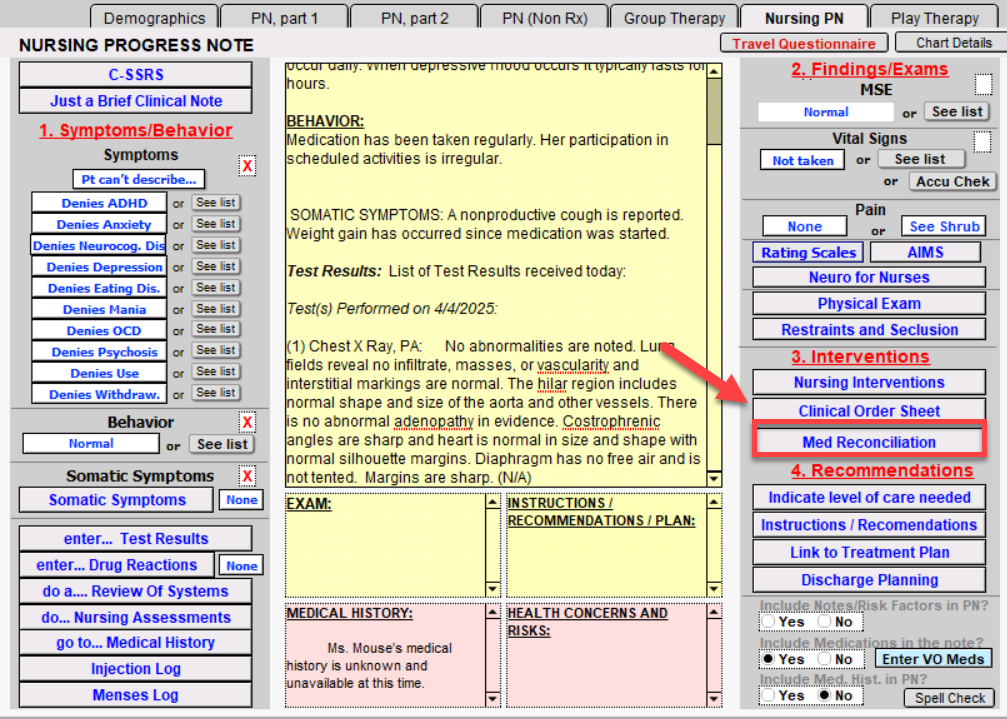 Medication Reconciliation is only performed at the intake/transfer of care. For normal progress notes please use the normal Medication Entry screen and choose a verb to Start, Stop or say Ext Provider Rx. From this area, you can add medications, allergies, diagnosis, and medications at discharge. A medication reconciliation note is created when the Confirm button on the right is pushed.
