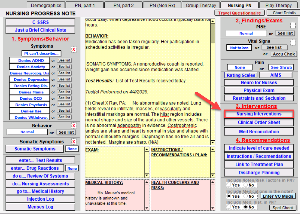 By clicking the Nursing Interventions button, you will be brought to the NURSING INTERVENTIONS window.