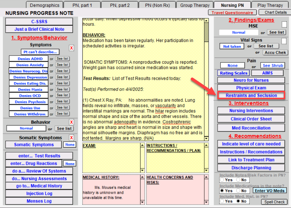 You can document the need for restraints and/or seclusion from the Restraints and Seclusion button. This will bring you to the RESTRAINTS AND SECLUSION window.