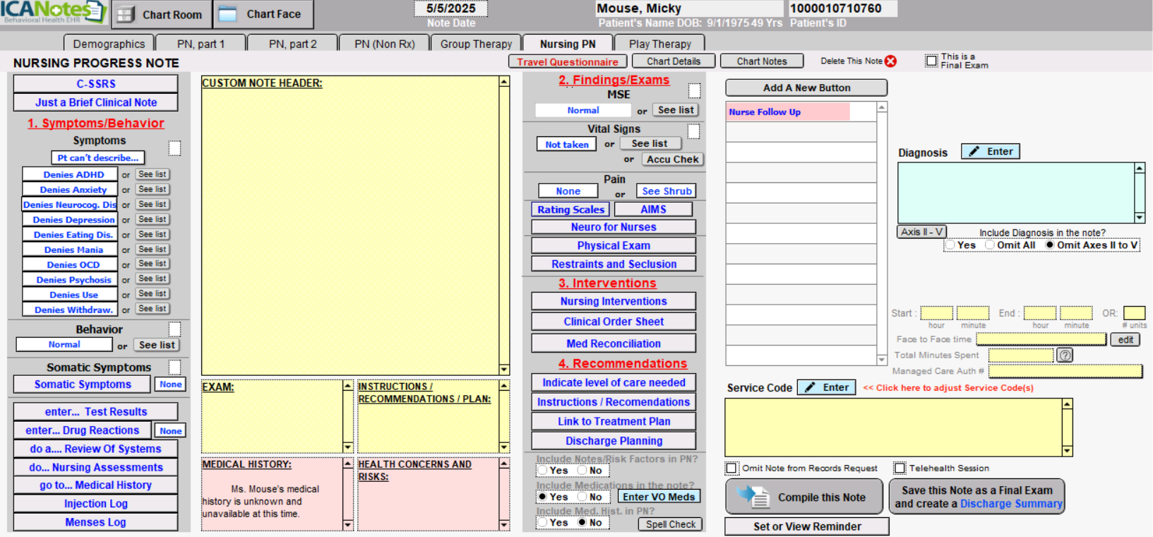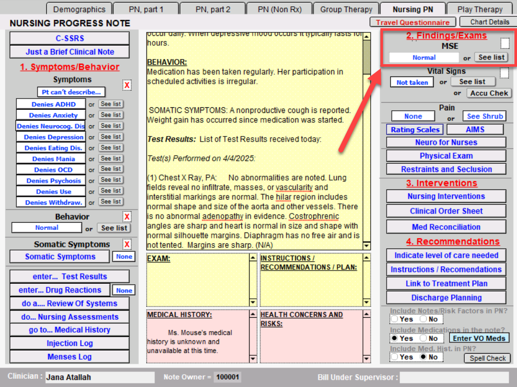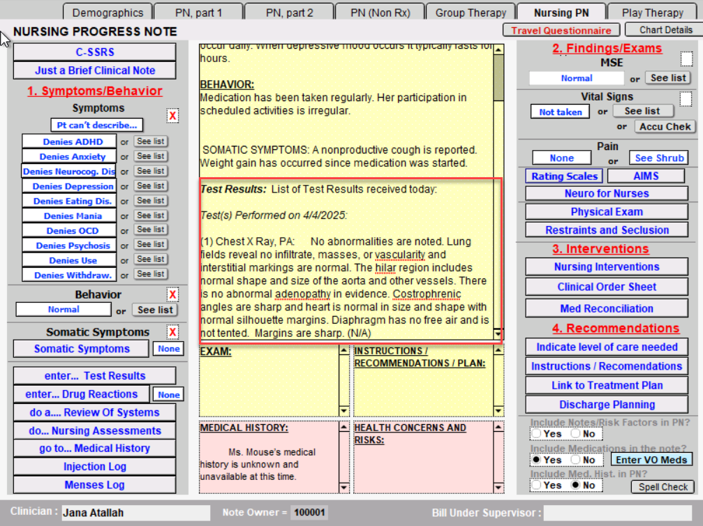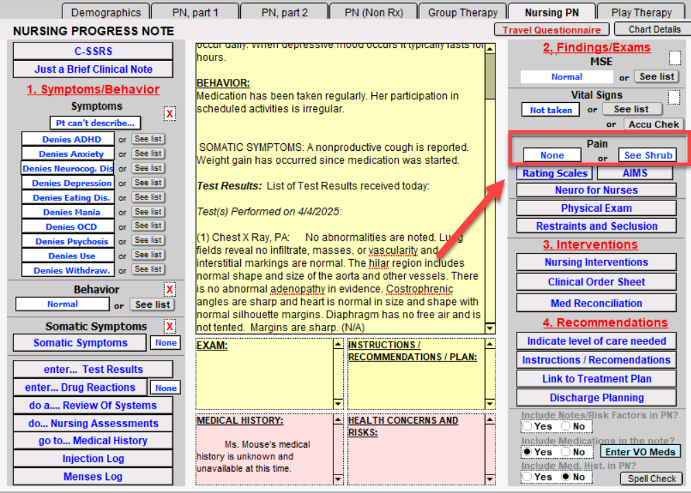 - Notes/Risk Factors included in PN: Notes and risk factors are cleaned from the information you input into the report via the shrubs. This area is also able to be typed in. This will show on the patient's Chart Face.