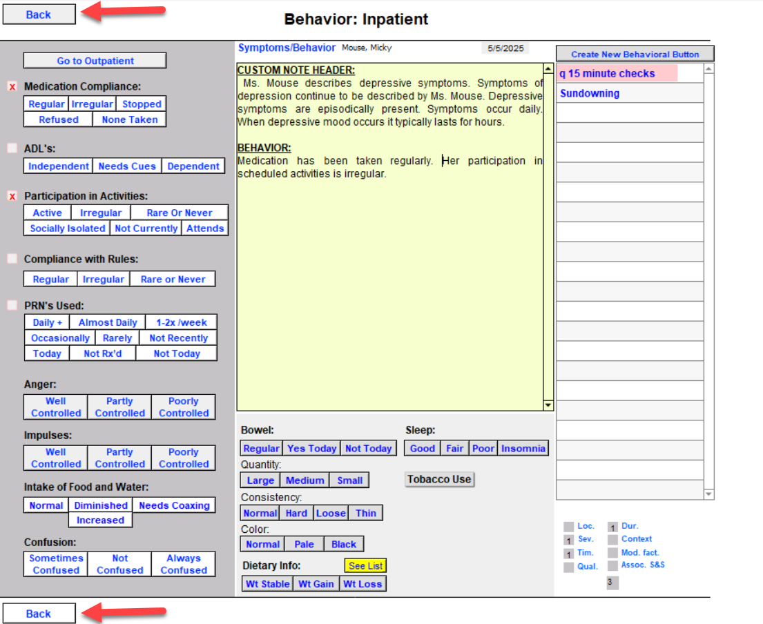 The Behavior button can be used to document a wide variety of divergent behaviors. We have clicked the Behavior See list button and, from the buttons in the left column, chosen to record that our patient has Regular Medication Compliance and that she is Irregular in Participation in Activities. Click the Back button to return to the NURSING PROGRESS NOTE.