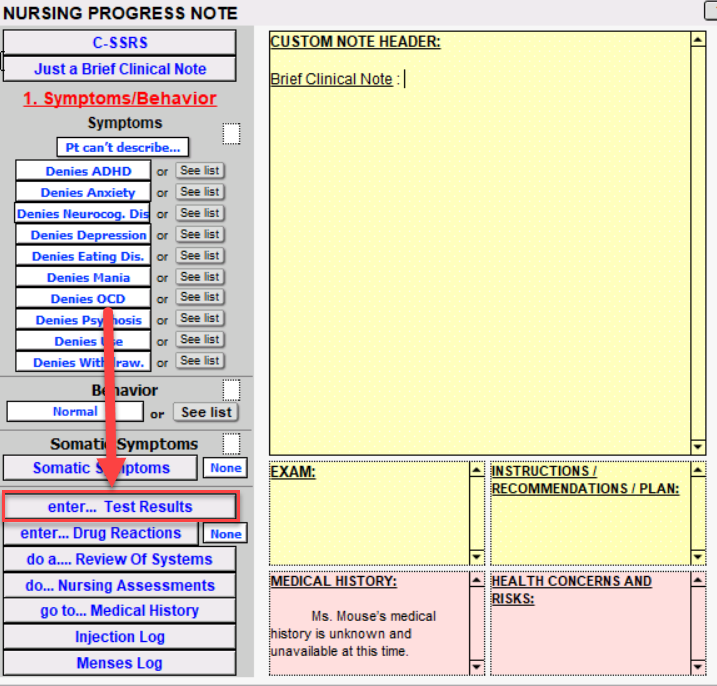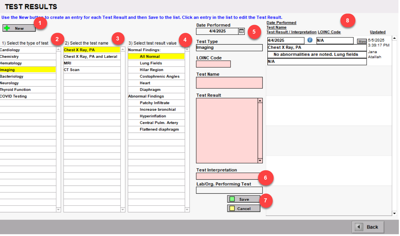 The enter... Test Results button will bring you to the Test Results window. This is where you can document tests and results.