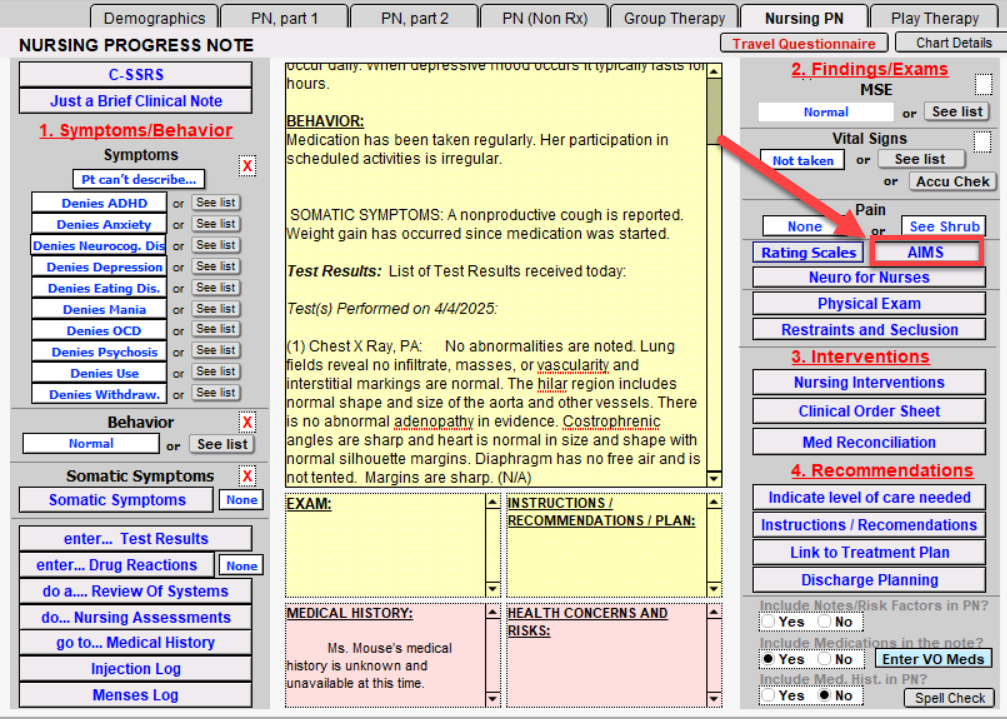 Push the AIMS button to document the Abnormal Involuntary Movement Scale. From here you can print, including the AIMS exam in the Mental Status Exam section of the note, mark all normal, and set due date.