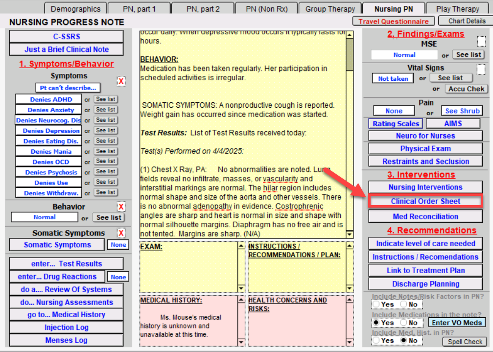 The Clinical Order Sheet button will bring you to the Clinical Order Sheet. This is an area where you can document orders, protocols, labs, and imaging. This is a great inpatient tool.