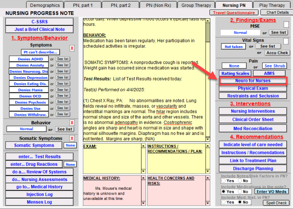 Clicking the Neuro for Nurses button will open to the NEURO FOR NURSES window. This is where you can document the neurological assessment.