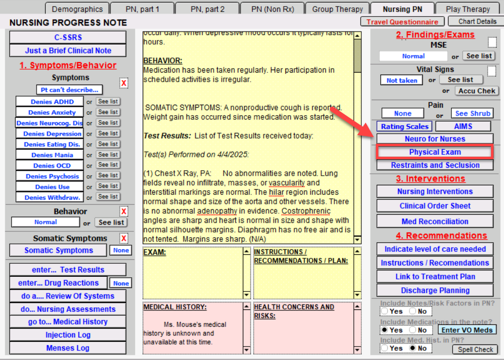 Clicking the Physical Exam button will open to the PHYSICAL EXAM window. Once documented, click the Back button.