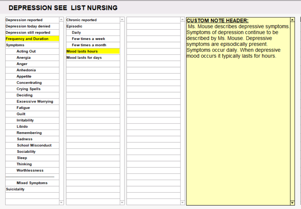 We click Depression still reported from the first column of the shrub. Next, we click Frequency and Duration from the first column and our shrub branches to display a second column. We choose Episodic and then the frequency as Daily and that the Mood lasts for hours. Each time you click an option on the shrub, the program inserts a corresponding sentence into your narrative (see screenshot below).