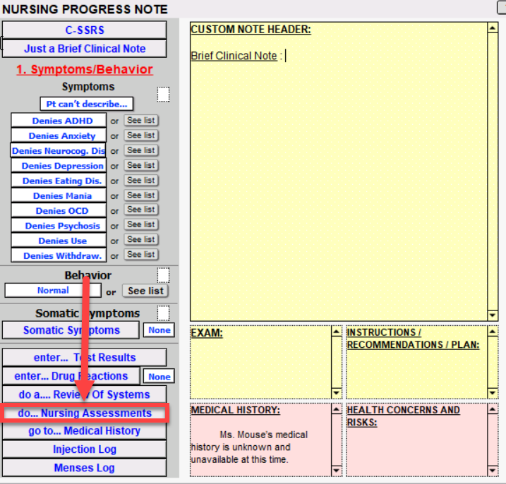 Click on the do... Nursing Assessments button to enter the Nursing Assessments window. An example of each button is seen below. Use the shrubs to enter documentation for each nursing assessment.