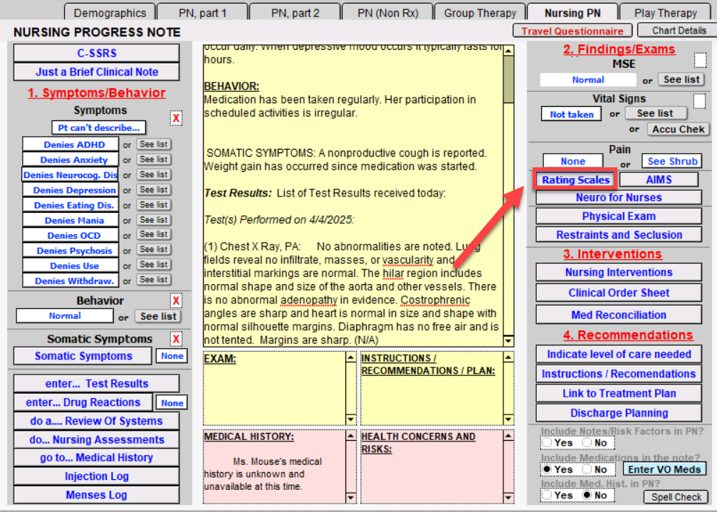 Click on Rating Scales button to enter test scores from psychologic testing.
