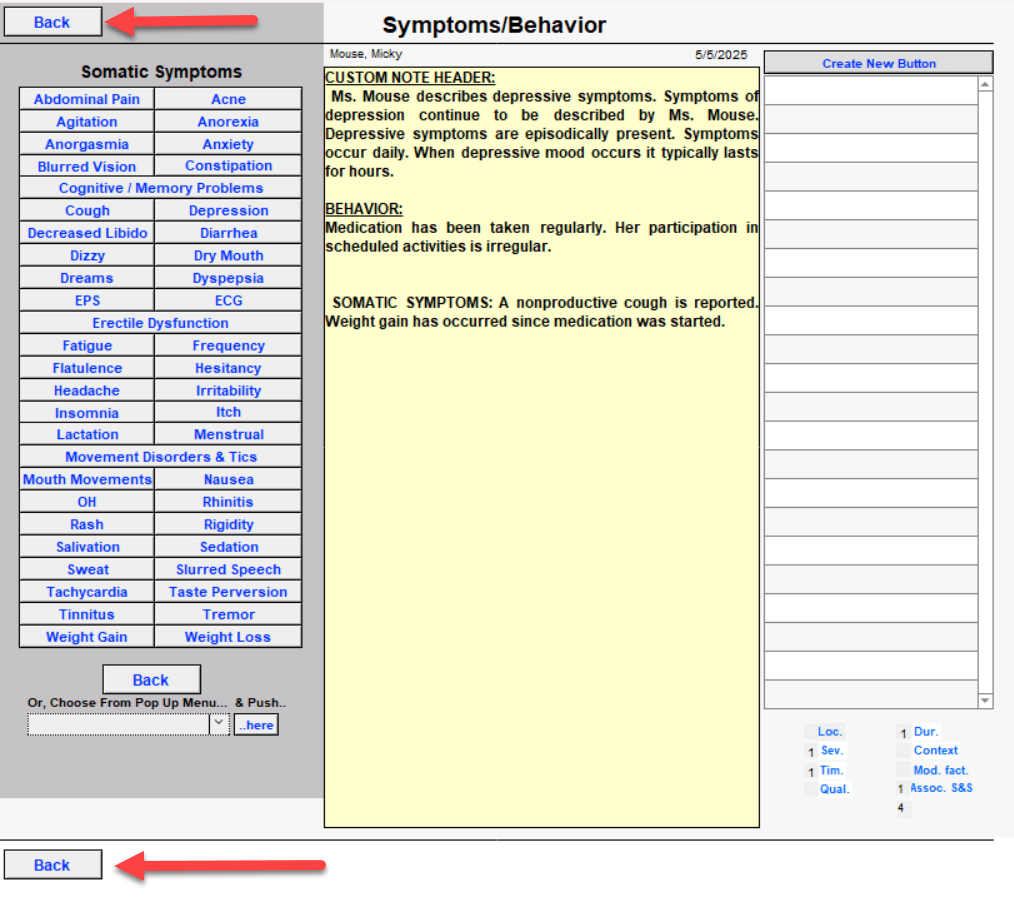 In the Somatic Symptoms window, the Cough and Weight Loss buttons are pressed. Click the Back button.