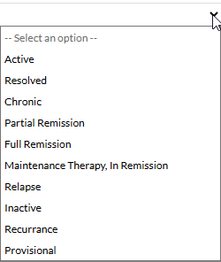 After selecting the diagnosis code, select status from the adjacent dropdown. The following statuses can be assigned:
