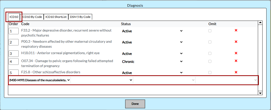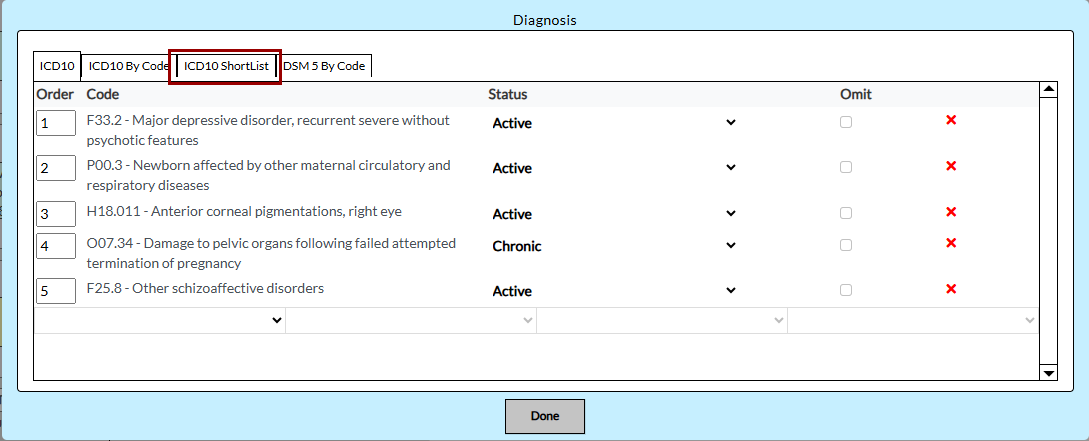 - Use the ICD-10 Shortlist tab, which displays only the configured ICD-10 codes.