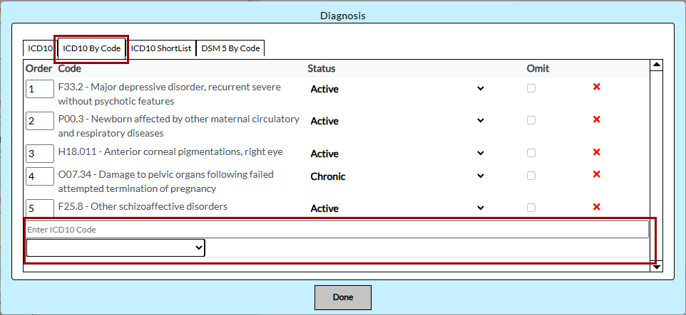 - Type the ICD-10 code or description and select it from the populated list.