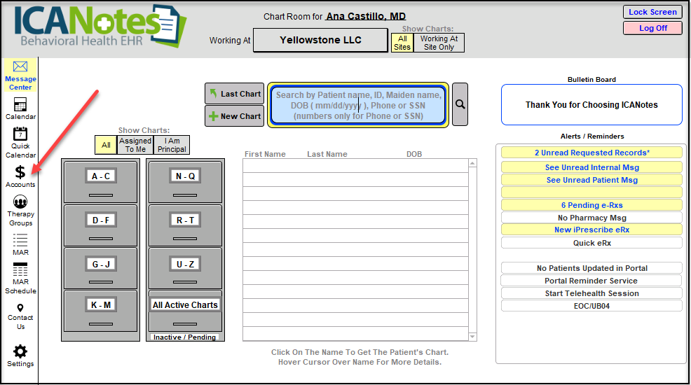 1. Navigate to Patient Accounts from the Chart Room by clicking the Patient Accounts button.