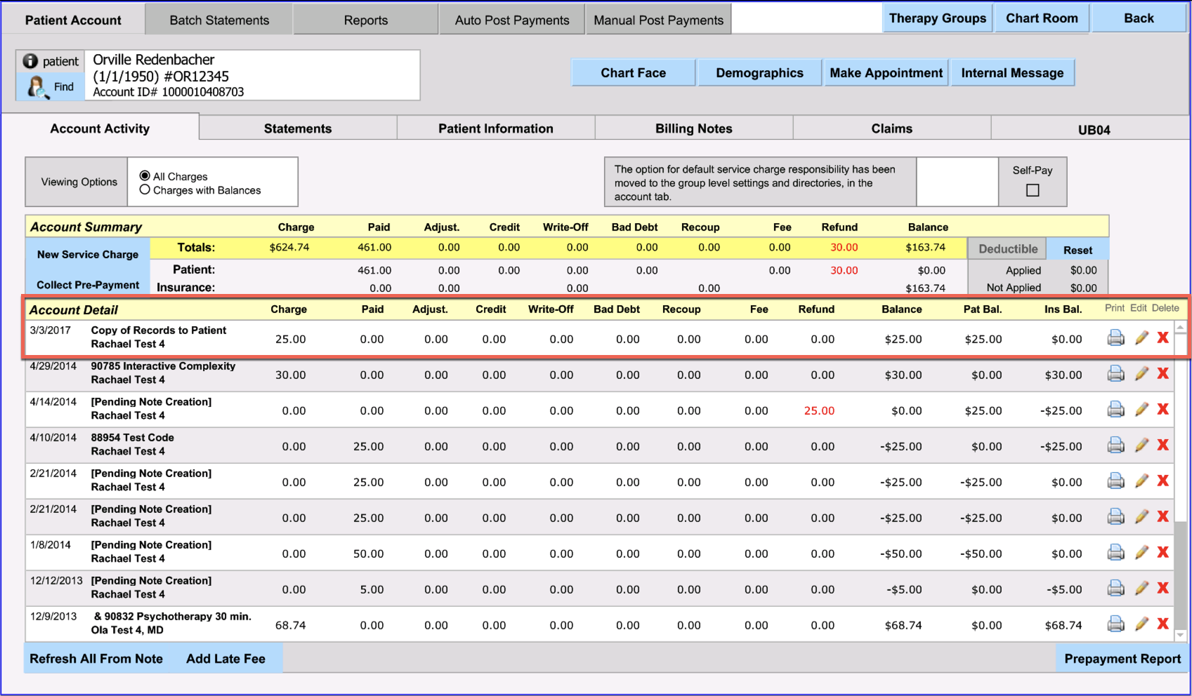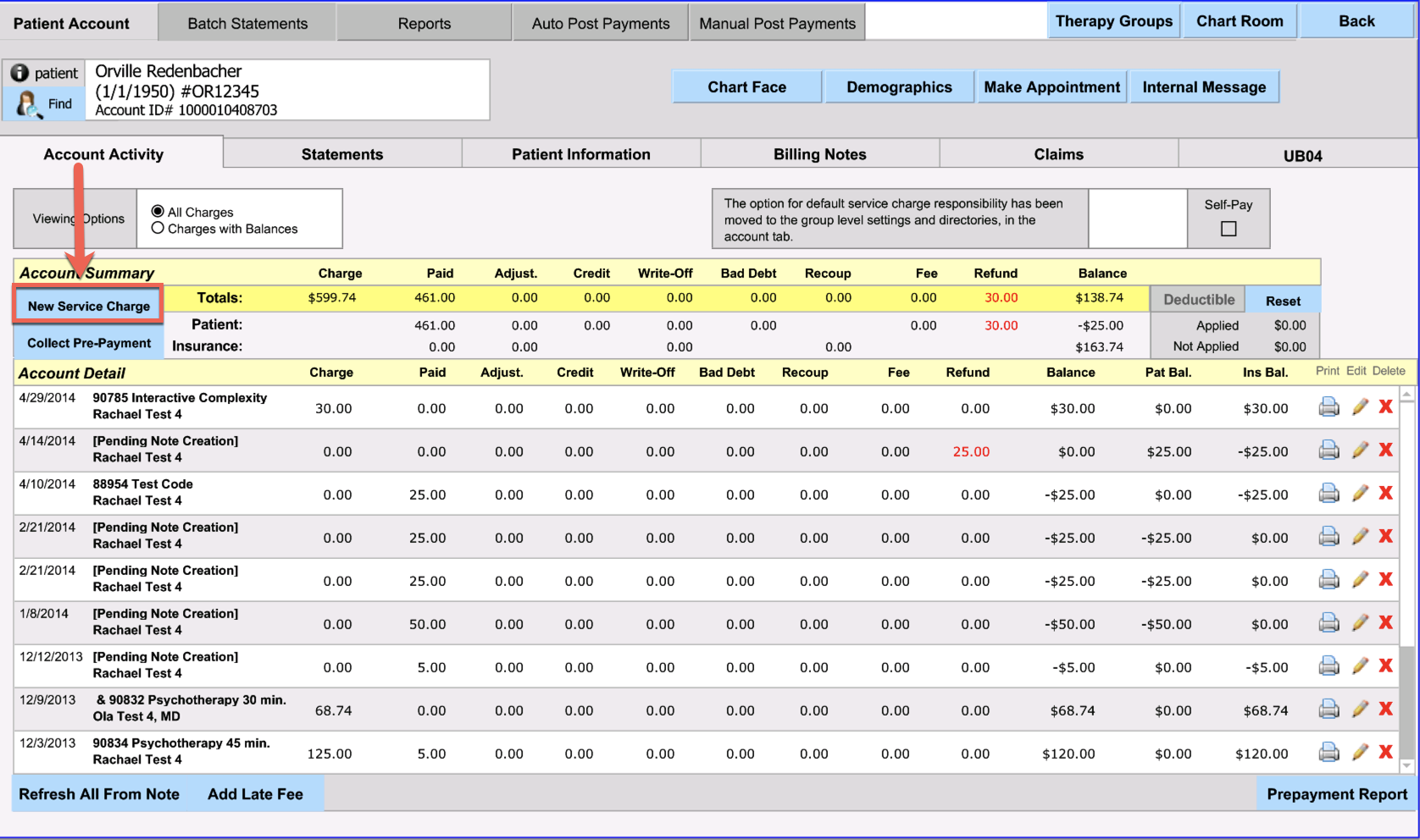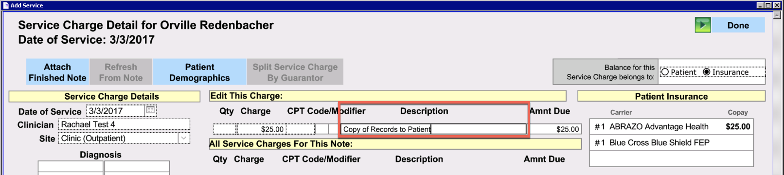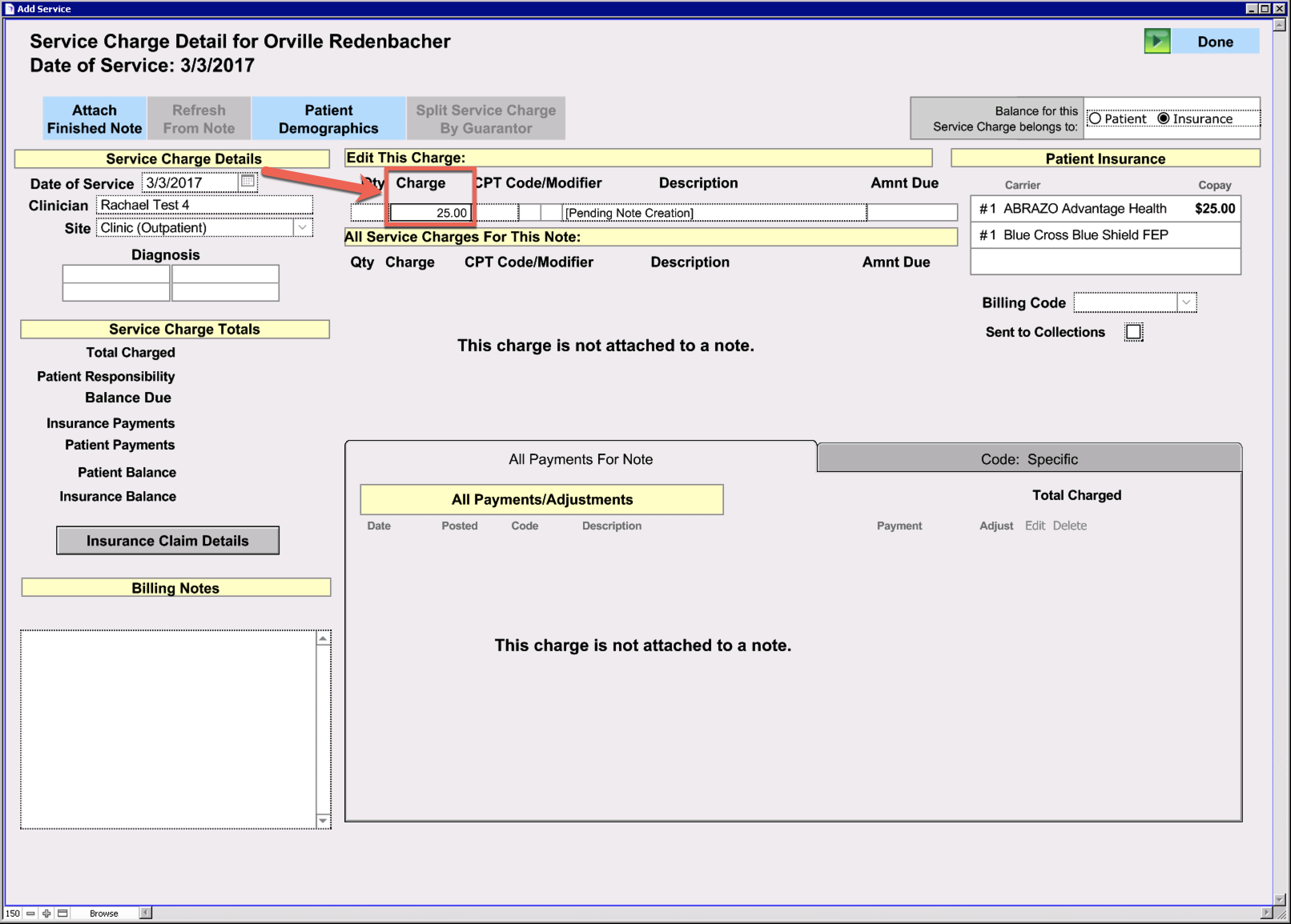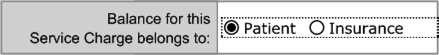 7. Be sure to change the 'Balance for this Service Charge belongs to' field in the top right-hand corner from 'insurance' to 'patient.'