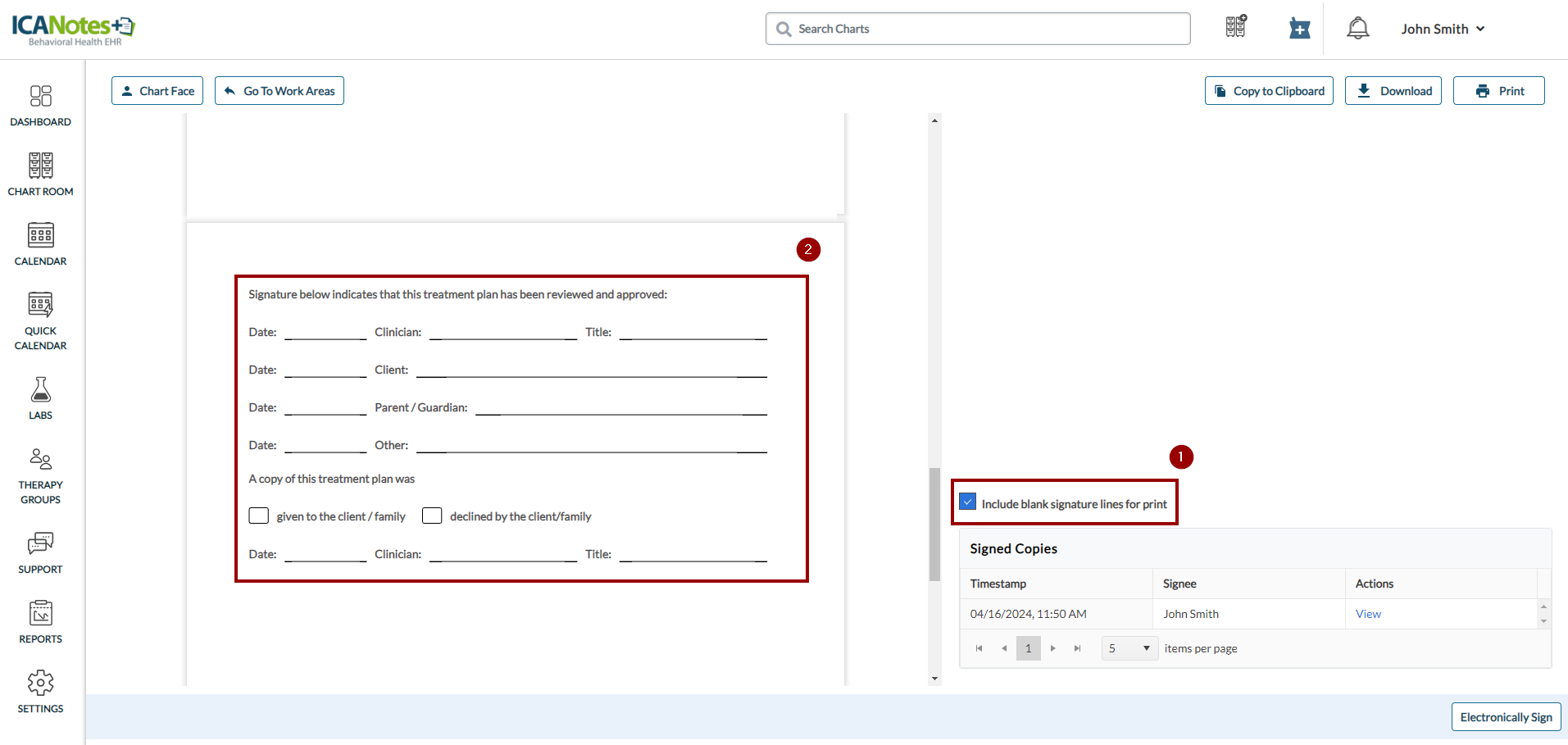 After printing, you can manually collect signatures from the relevant individuals, such as clinicians, clients, parents/guardians, or others.