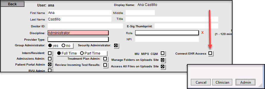 3. Click ConnectEHR. You will see a prompt asking if you want to set the user as a Clinician, Admin or cancel. To activate a clinician, they will need to have an NPI placed on settings.