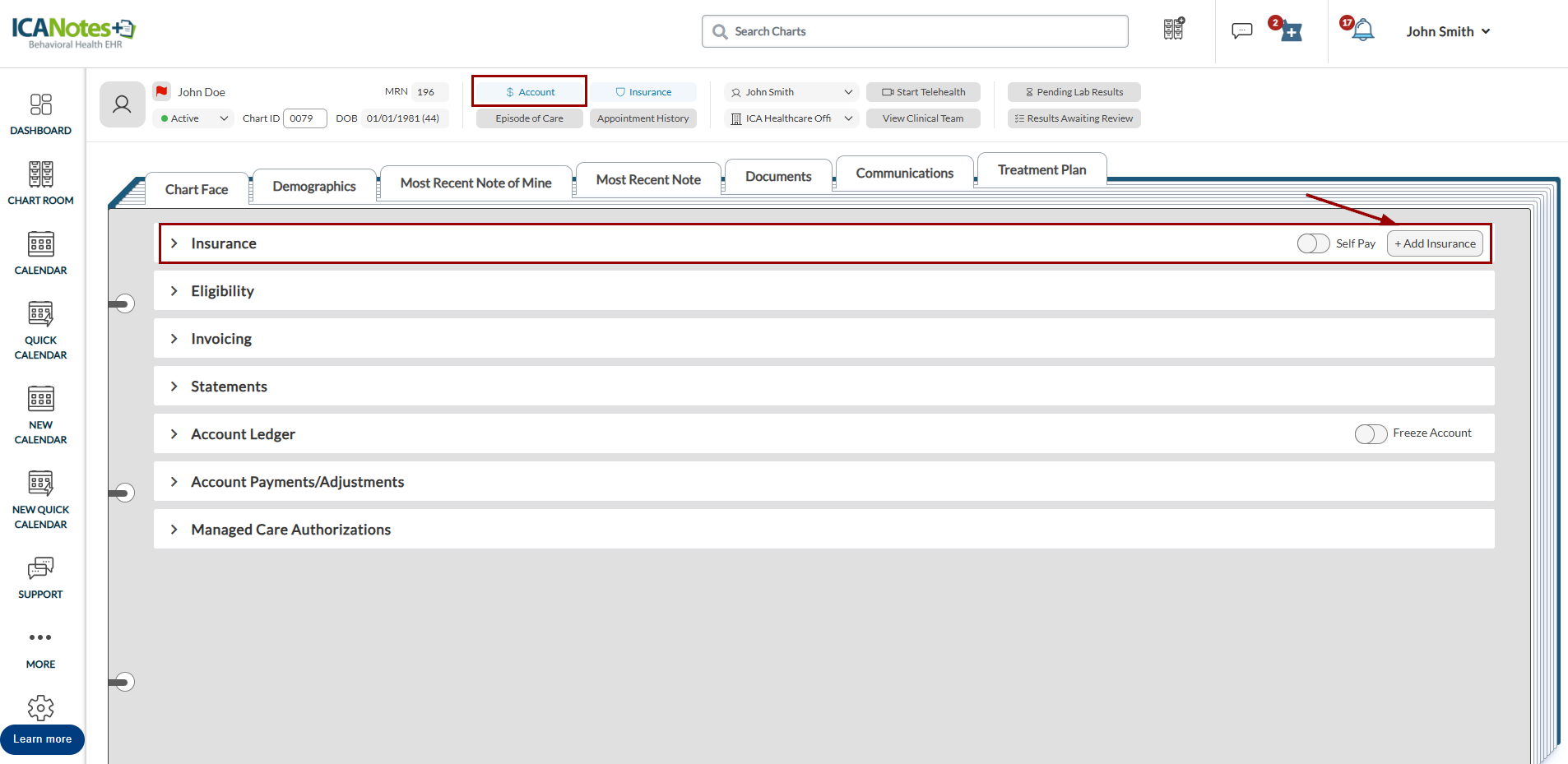 This article explains how to add insurance information for a client. You can add primary, secondary, tertiary, or other types of insurance. A client’s active primary and secondary insurances appear in the summary bar, so you do not need to expand the Insurance panel to view them.