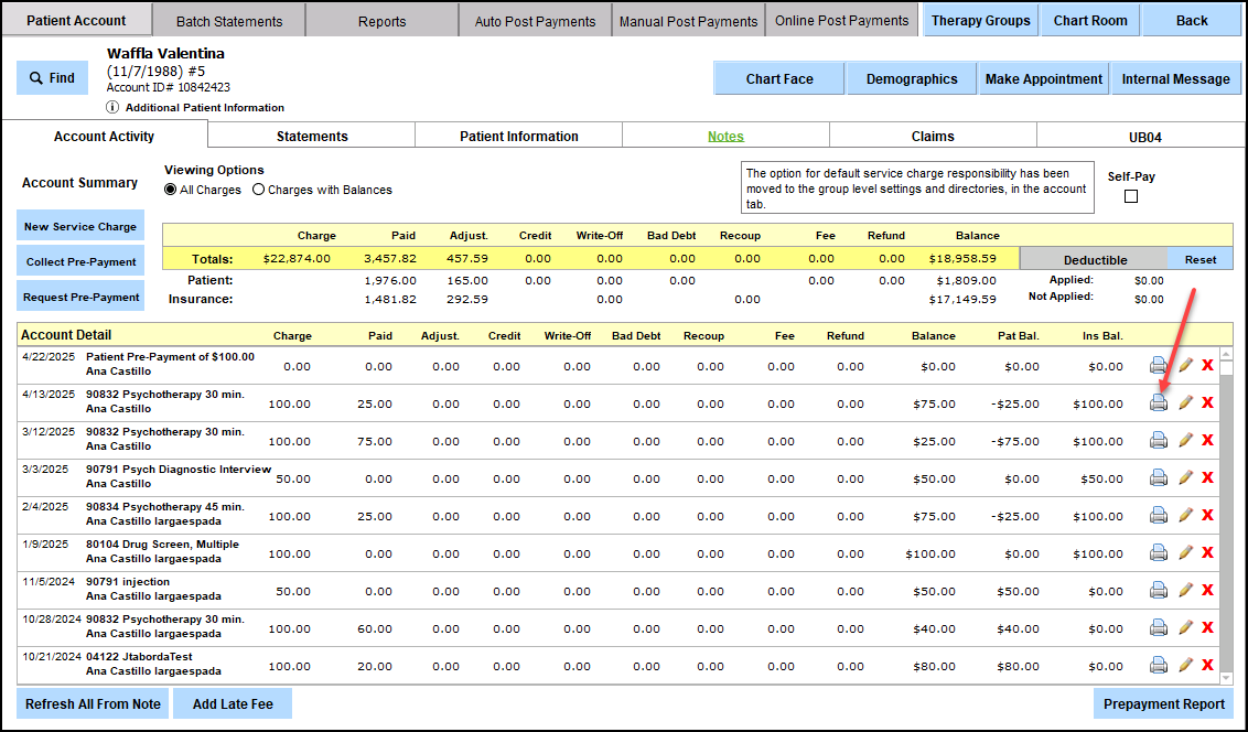 2. Find the appropriate service charge. Click the printer icon.