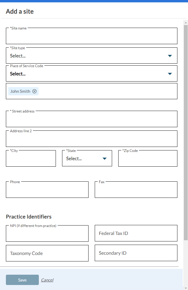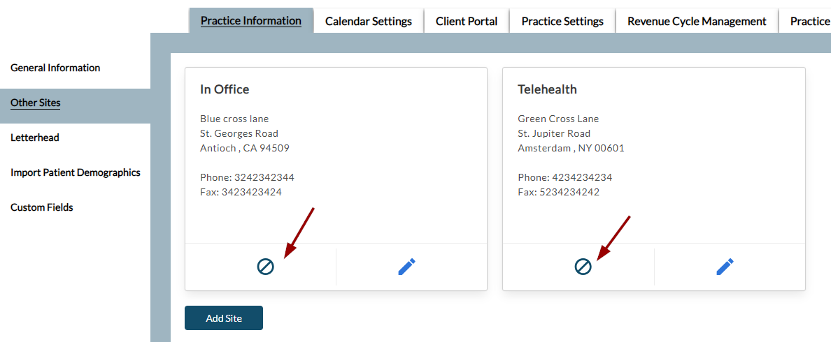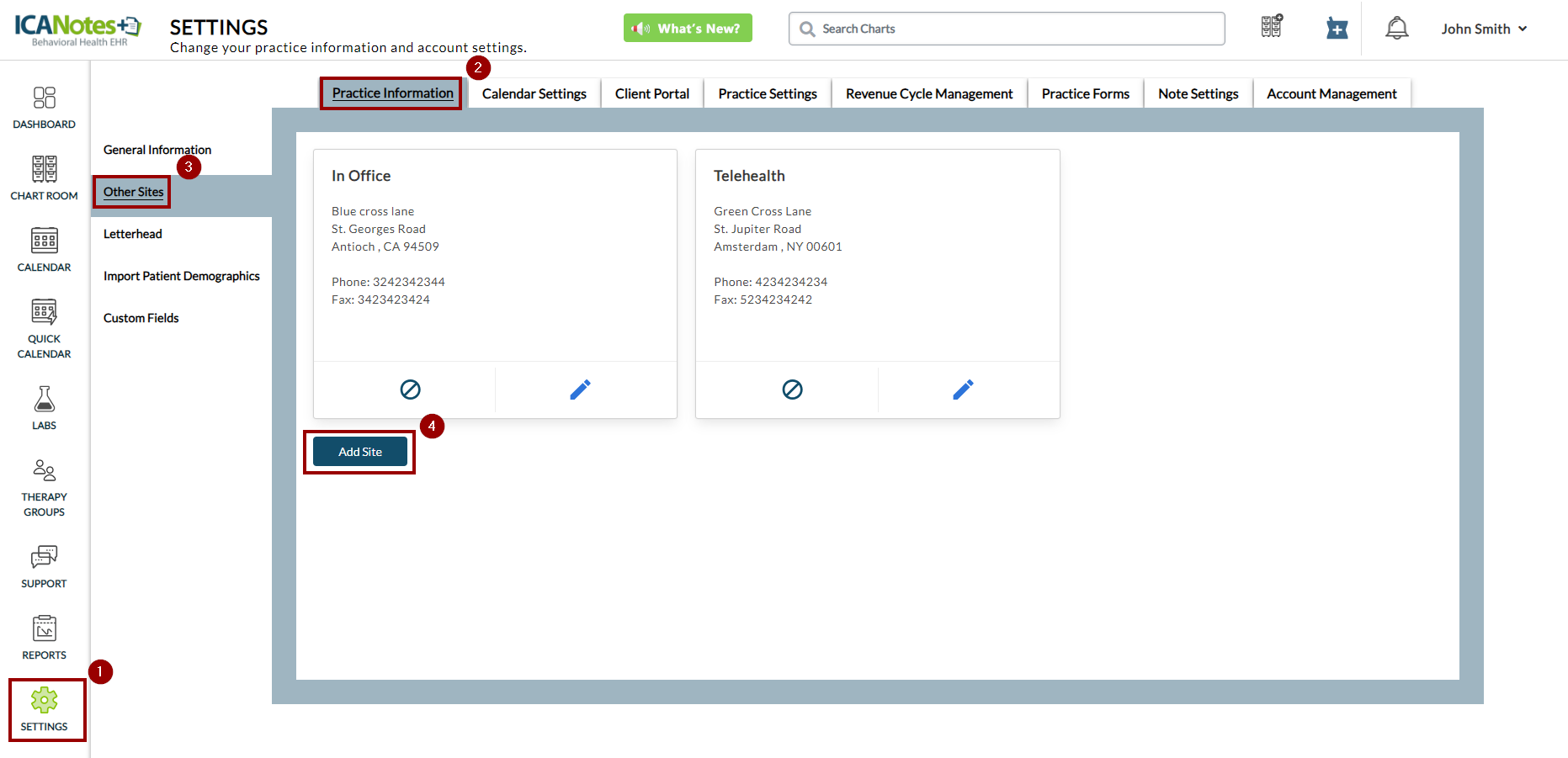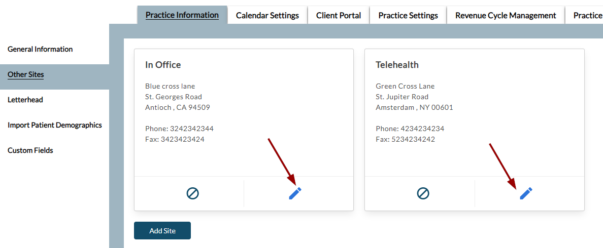 To add a new site, go to Settings > Practice Information > Other Sites and click Add Site, as shown below: