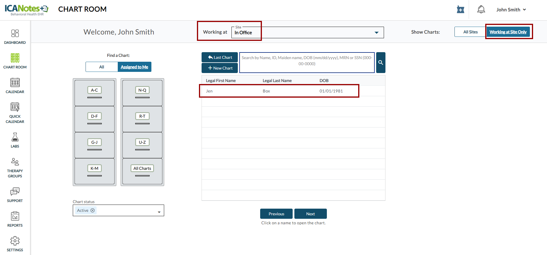 In the Chart Room, the client list is filtered by the location they’re assigned to. For example, if a client is assigned to "In Office," selecting this location from the Working at dropdown and choosing Working at Site Only will display only clients from that site.