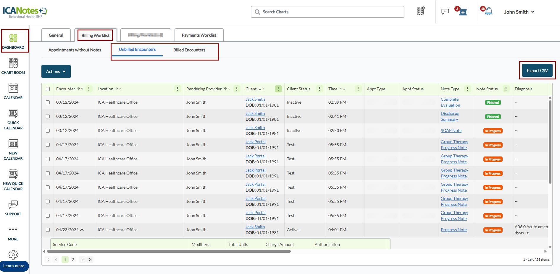 Navigate to Dashboard > Billing Worklist > Unbilled Encounters tab. If you have added service codes to the note, they will also be displayed on the Unbilled Encounters screen.