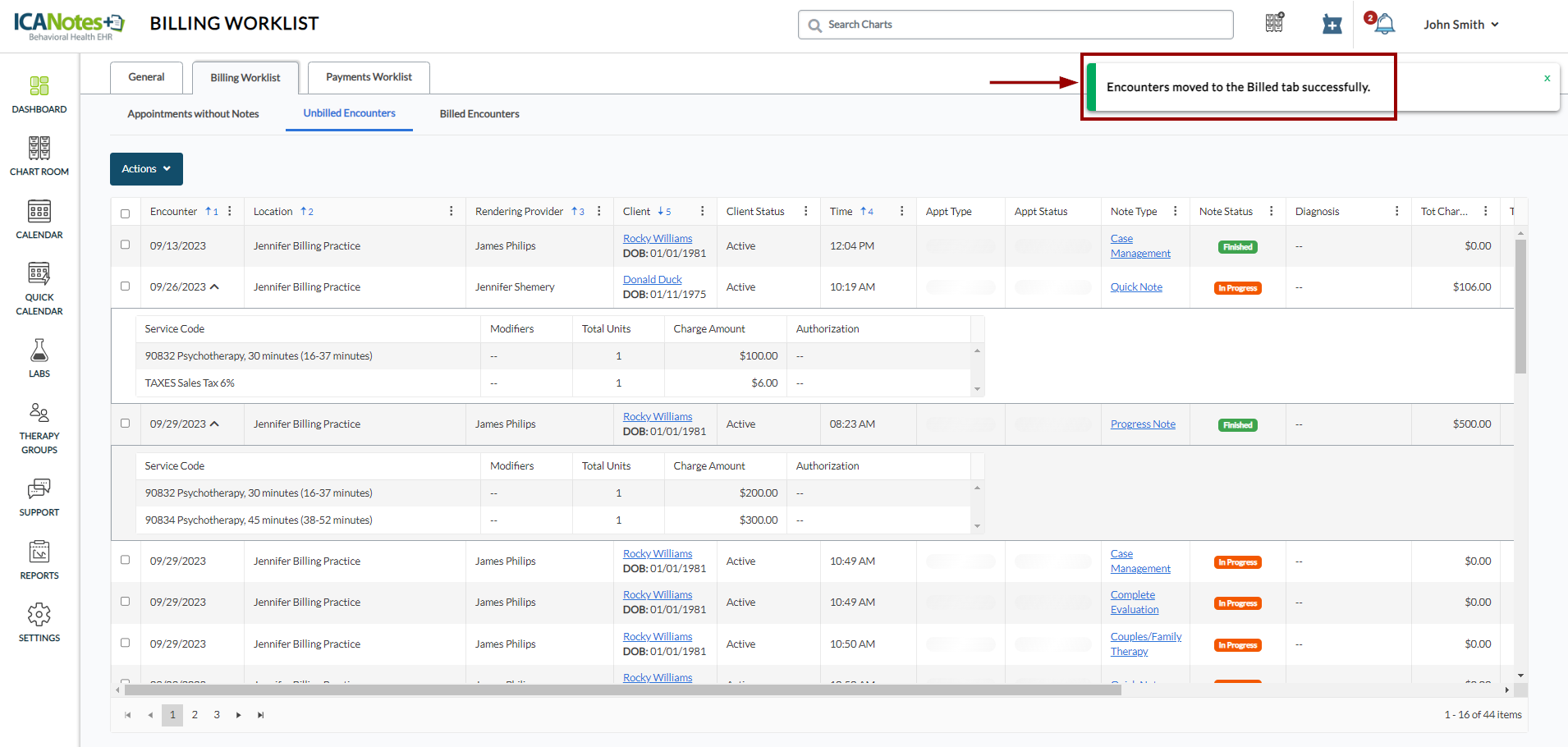 After the encounters are moved to the Billed Encounters tab, a success message will appear as shown below: