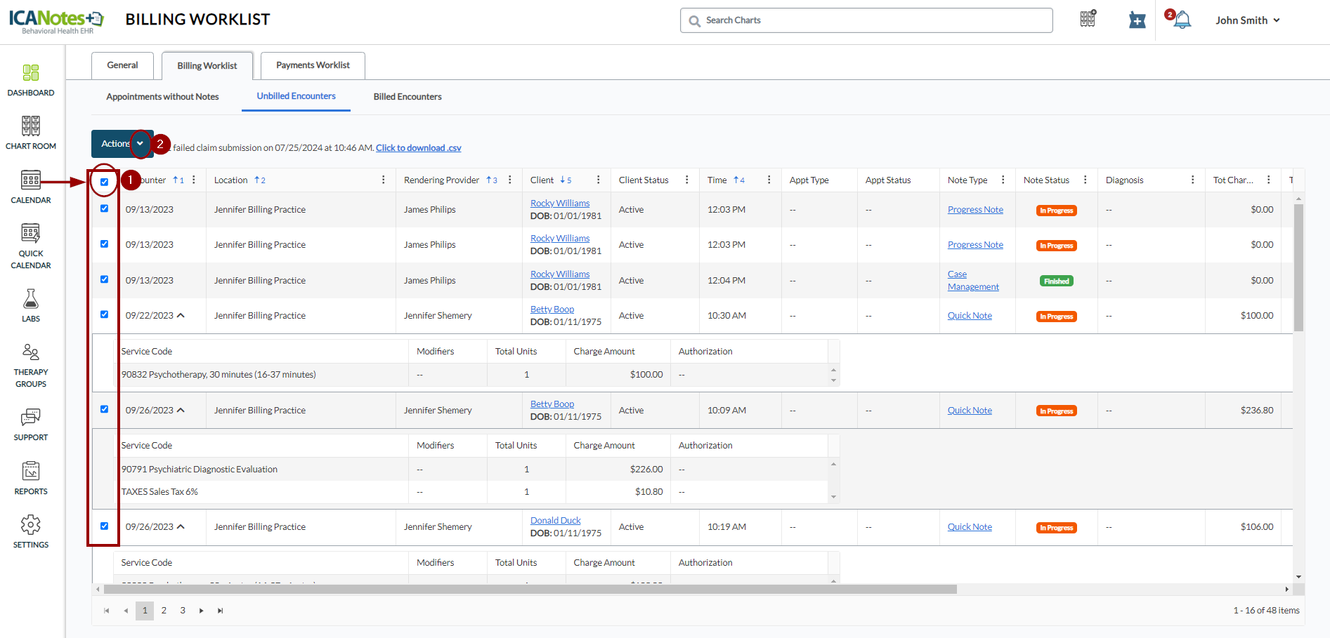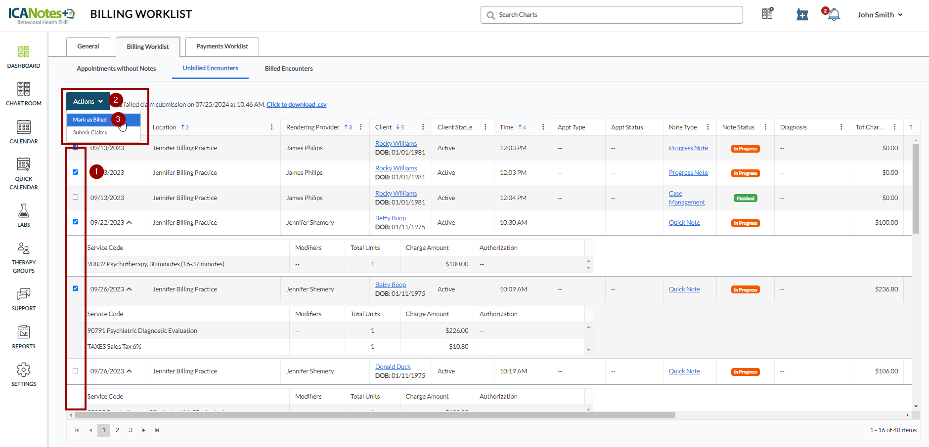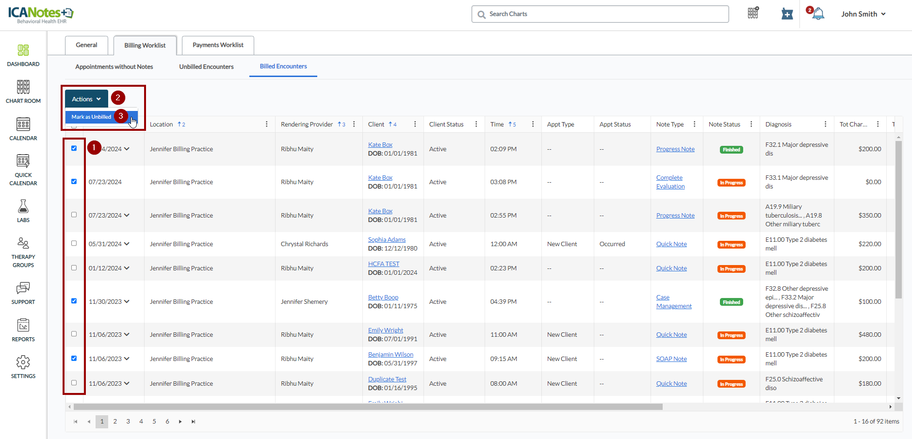 ICANotes+ allows you to move encounters back to the Unbilled Encounters tab if they were marked as billed by mistake. Select one or more encounters from the list, click the Actions dropdown at the top, and select the Mark as Unbilled option as shown below: