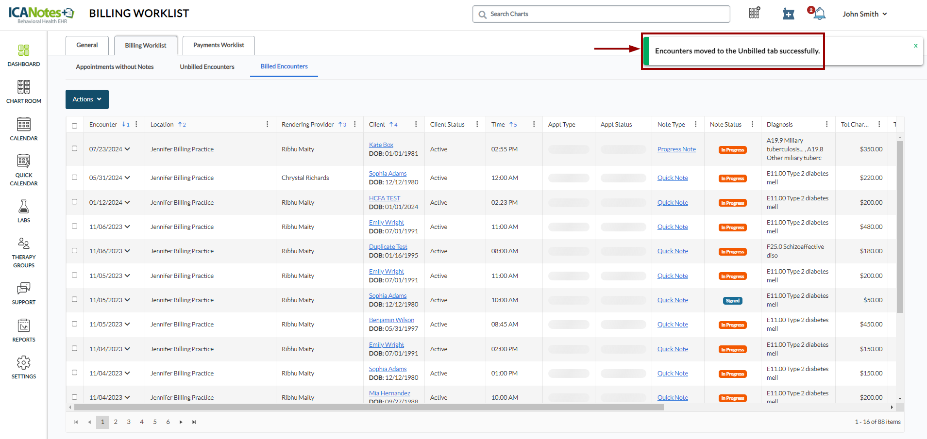 After the encounters are moved back to the Unbilled Encounters tab, a success message will appear as shown below: