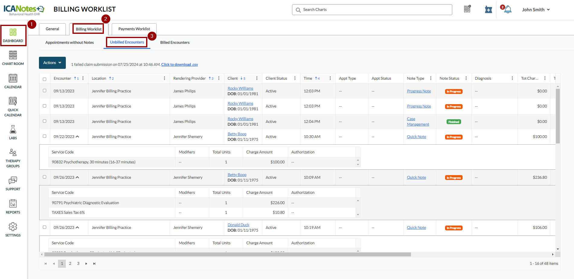 ICANotes+ enables you to track charges billed to clients or insurance providers. In cases where payments are posted outside ICANotes+ or involve paper claims, you can manually record these payments within the system. Initially, these entries will appear under the Unbilled Encounters tab, from which you can select and transfer them to the Billed Encounters tab.