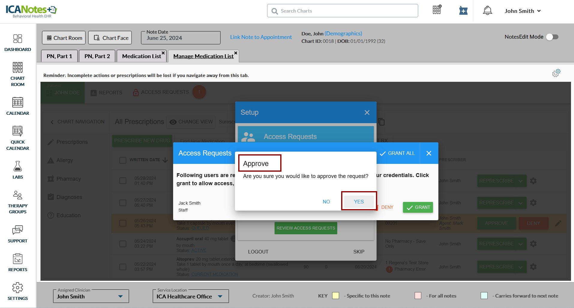 A confirmation screen appears as shown below to approve the request. Click Yes. This allows the users to prescribe the medications.