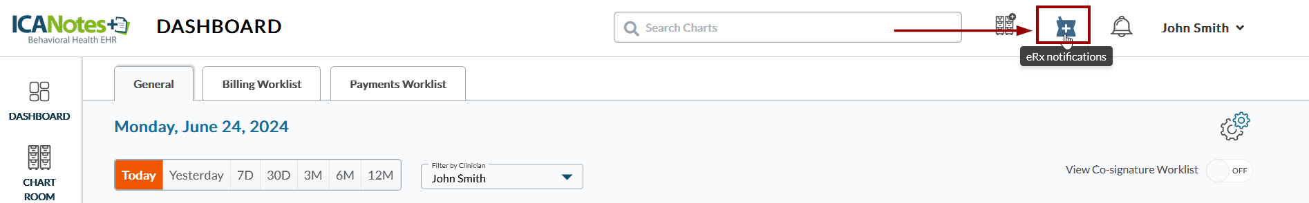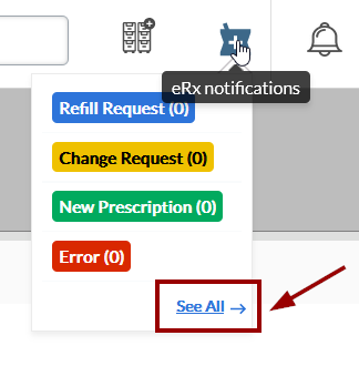 On the Dashboard, click the eRx notifications icon (plus icon) as highlighted on the screen.