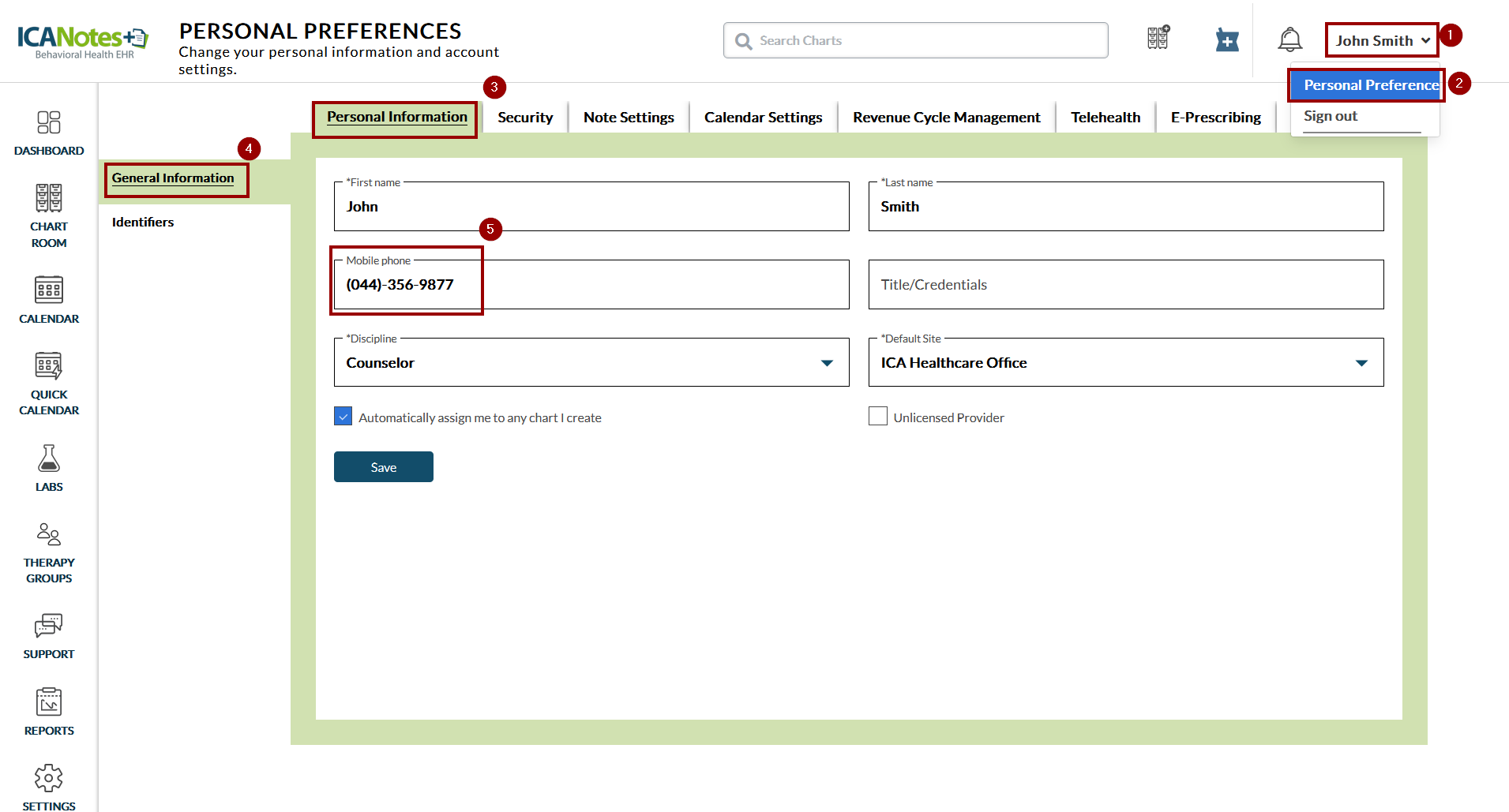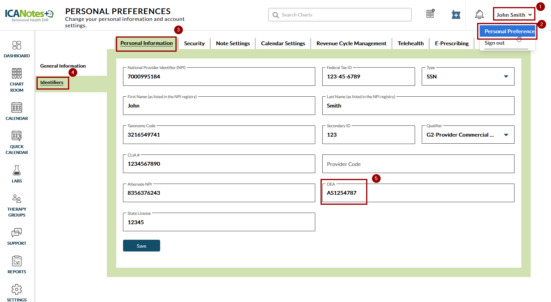 To configure the DEA number, navigate to Personal Preferences > Personal Information > Identifiers as shown in the screen below. Enter the DEA number in the designated field and click Save.