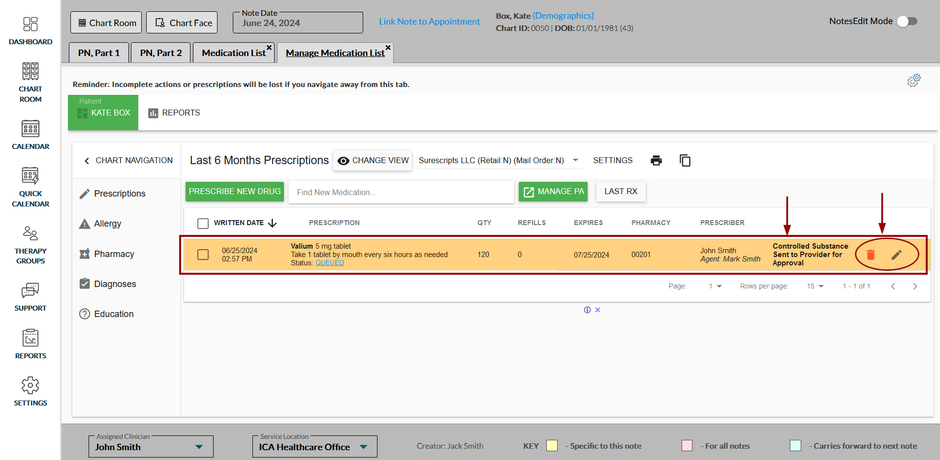 Note: At this moment, if you want to make any modifications to the EPCS drug, you can click the pencil icon to modify the details. You can also click the Delete icon to delete the EPCS prescription request.