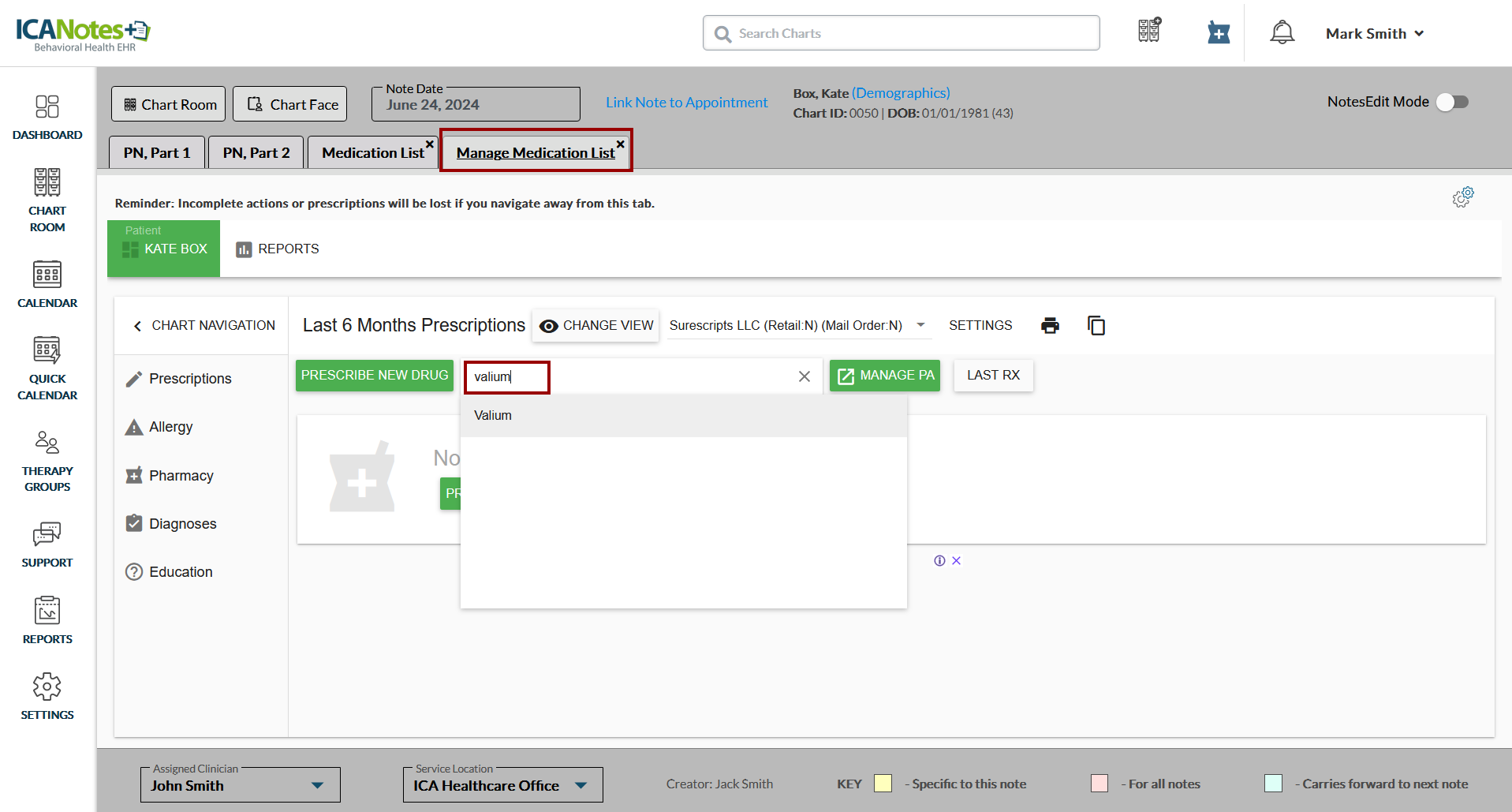 Once the users gain access to prescribe the EPCS drugs, they can prescribe them through the client's chart > medications section.