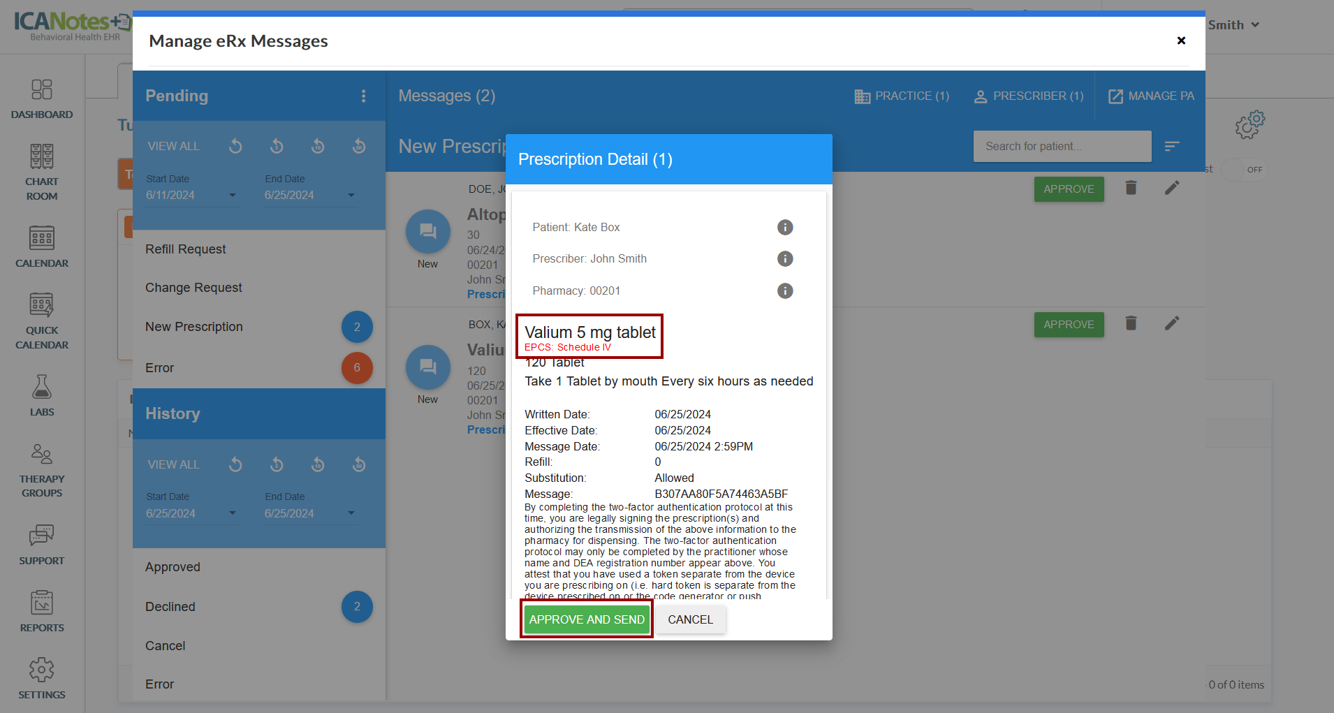 The Manage eRx Message appears as shown below with the EPCS drug for approval. Click the Approve button.