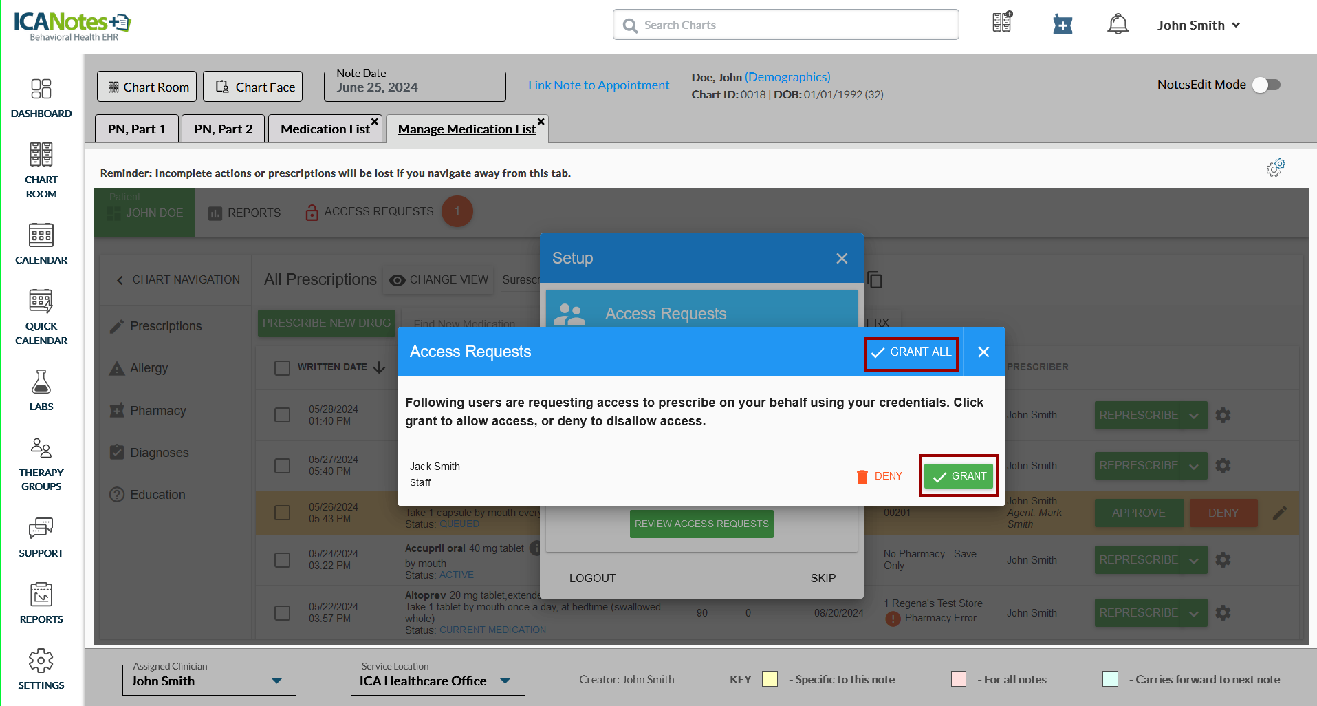 When users with the 'eRx Administrator' and 'Support eRx' roles are invited to ICANotes+, a request is automatically sent to the clinician to grant permission to prescribe medications. Once the clinician approves the request, the invited users can prescribe medications on behalf of the clinicians.