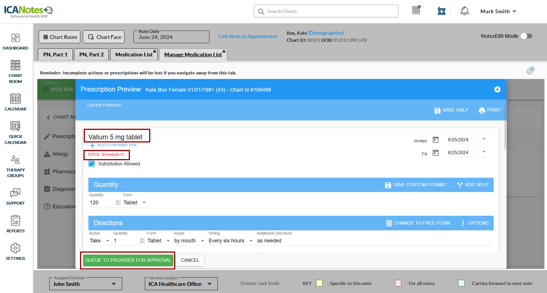 Only part-time or full-time prescribers can send prescription requests for the controlled substance to the pharmacy. When you invite users with the 'eRx Administrator' and 'Support eRx' roles in ICANotes+, a request is automatically sent to the clinician. Once the clinician approves the request, the invited users can prescribe the medications on behalf of clinicians.