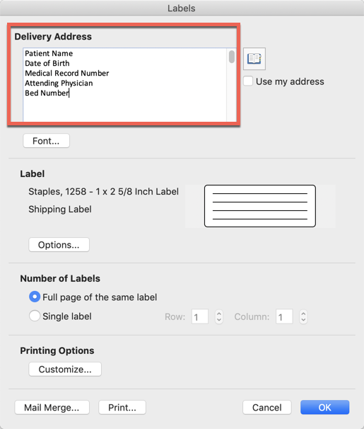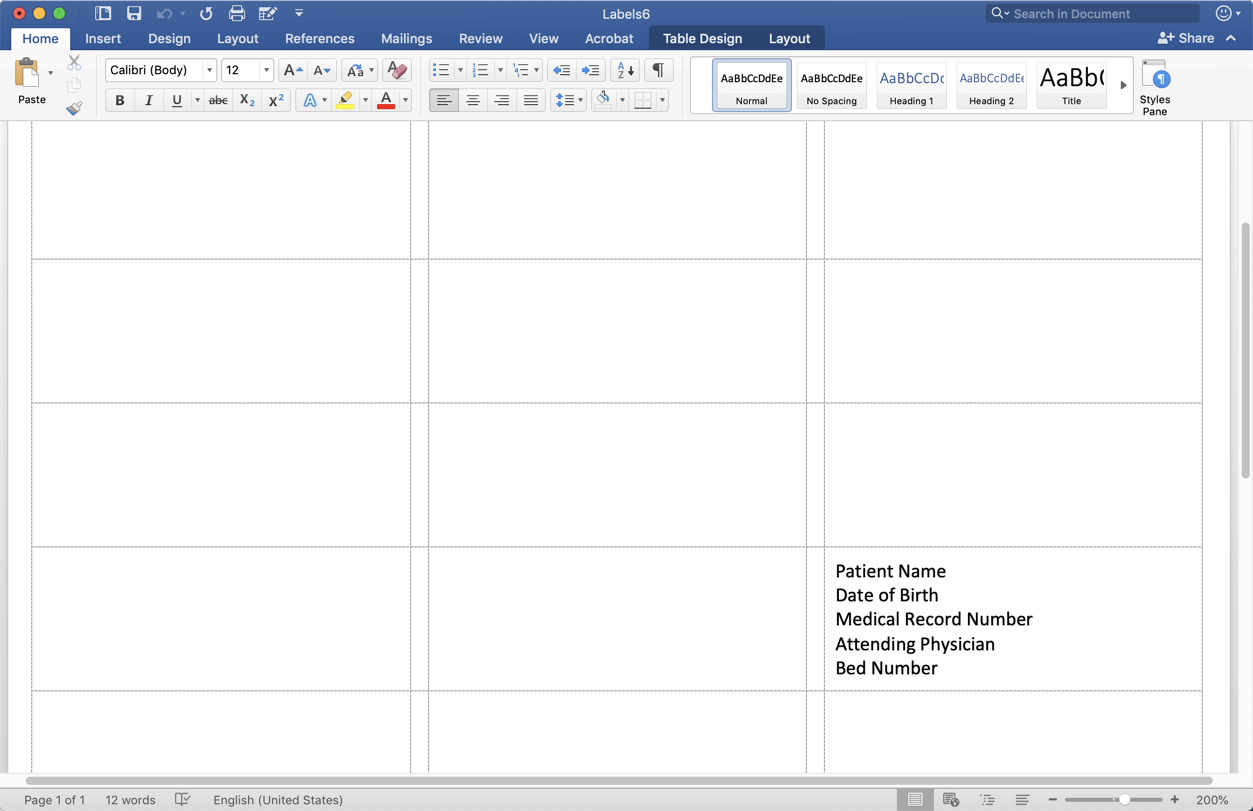This is a guide for inpatient facilities to print labels for their patients using Microsoft Word.