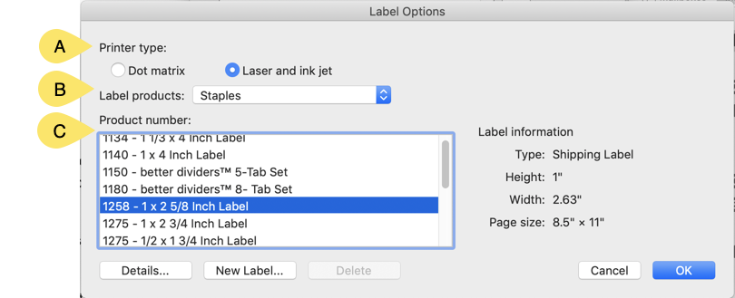 4. When you return to the Labels window, you need to decide if you want a full page of the same label (like if you were making return addresses of your facility) or just a single label. Use the appropriate radio button, and if you are using single, make a note of which row and which column the label will print. When ready, click the button.