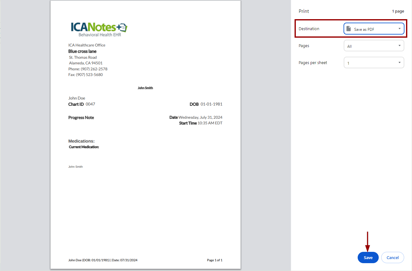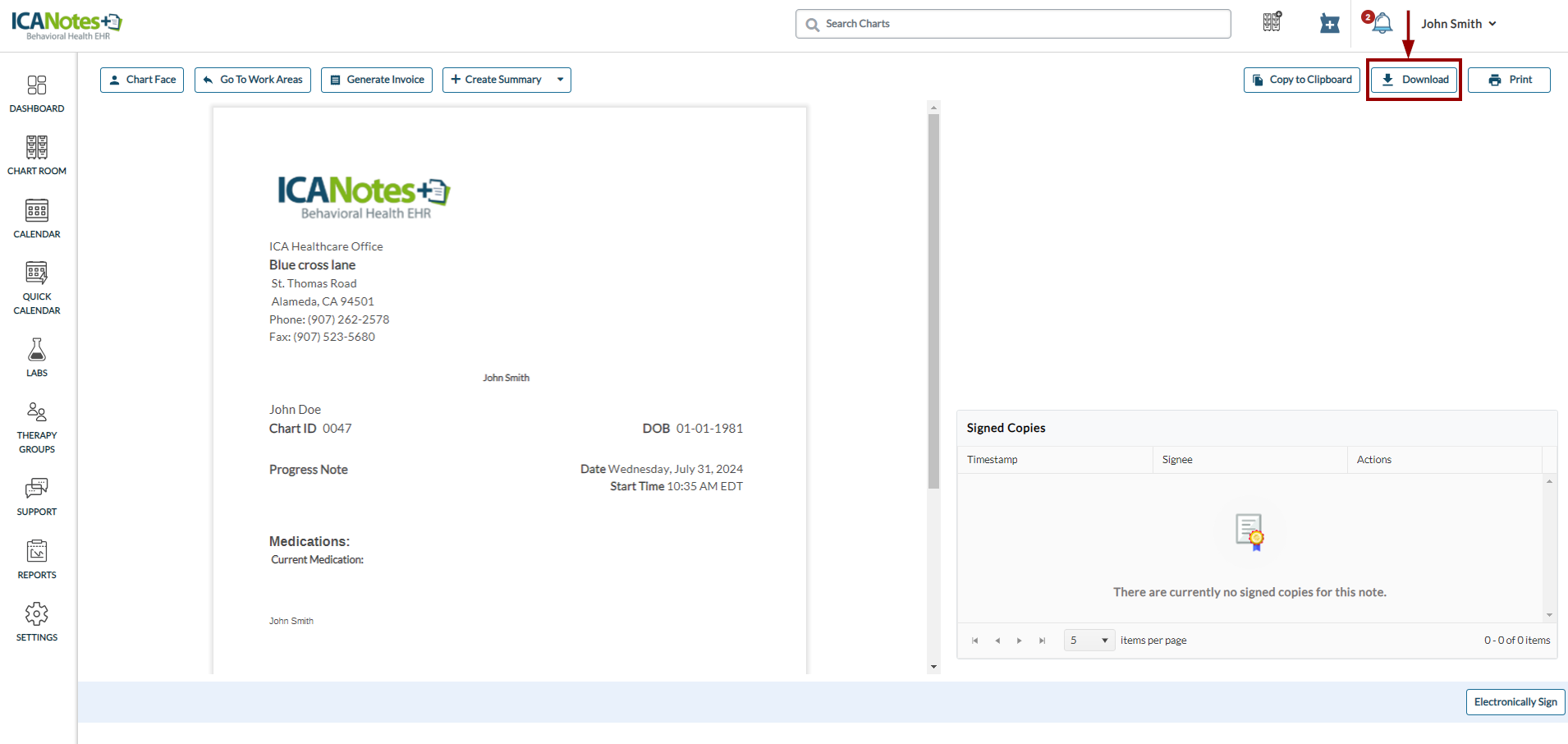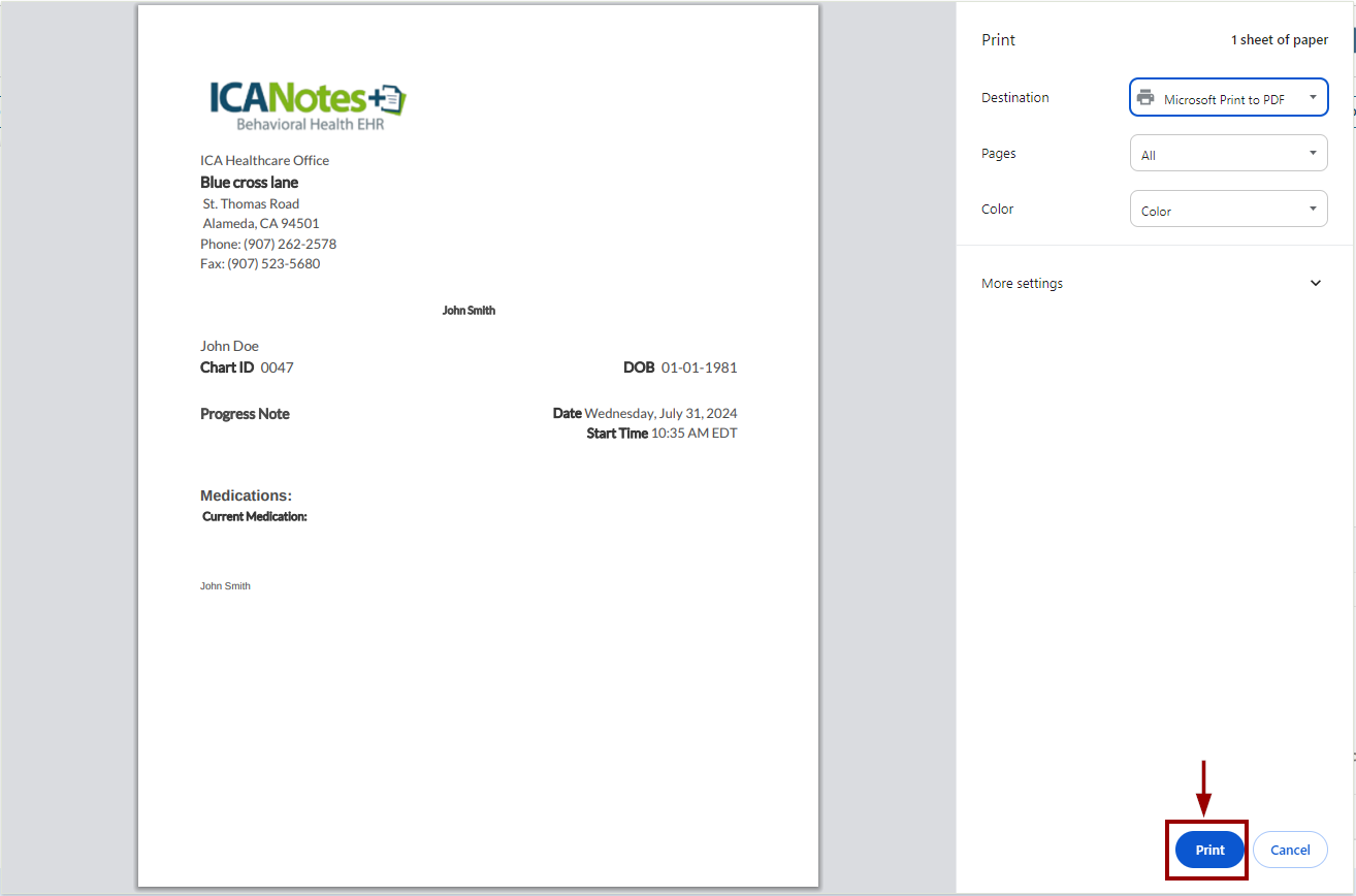Note: In this knowledge base article, the Progress Note is considered as an example. Similarly, you can print or download the respective notes.