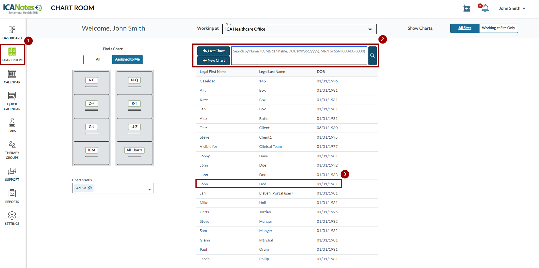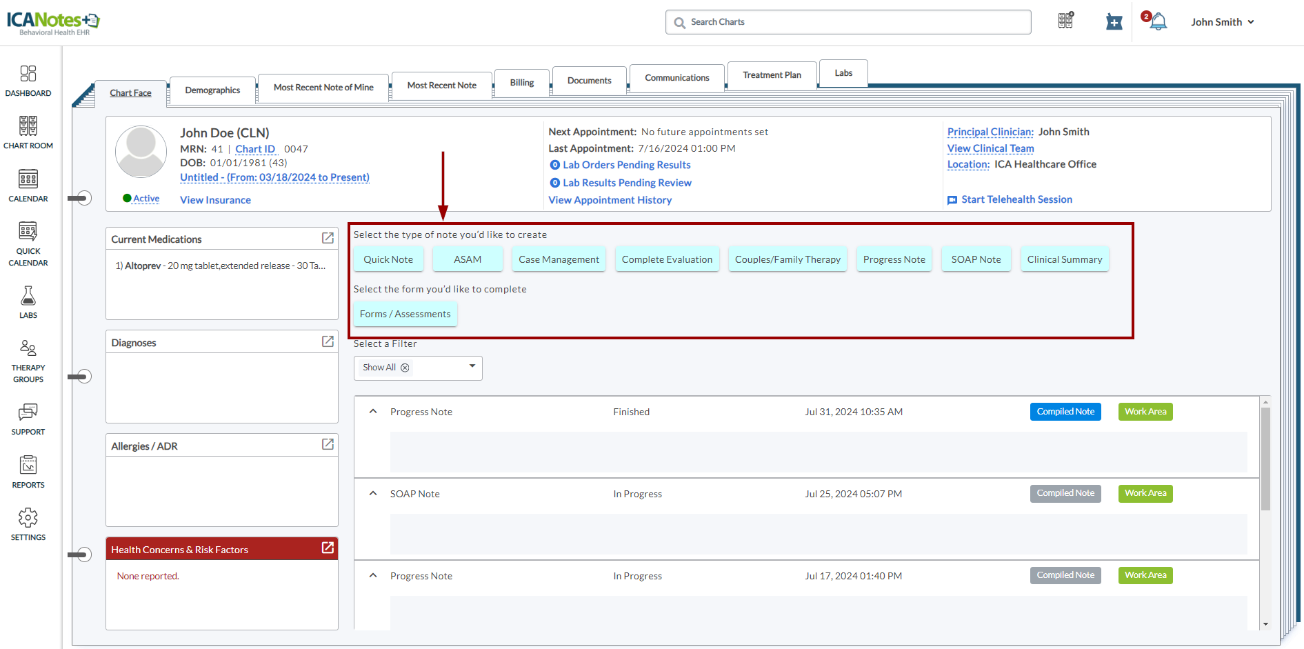 Navigate to the Chart Room and search for the desired client to create a note as shown below: