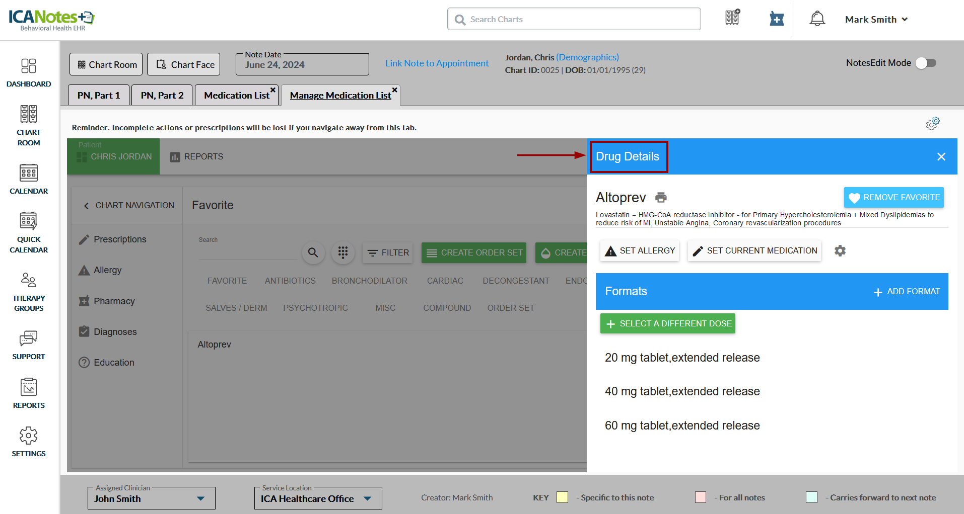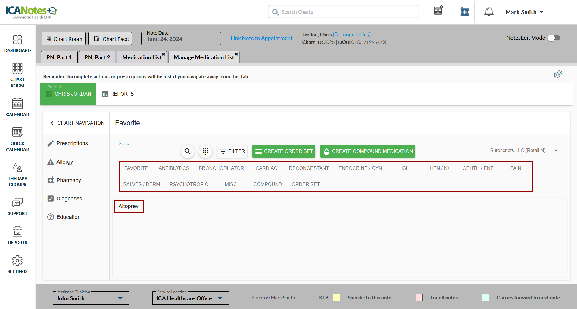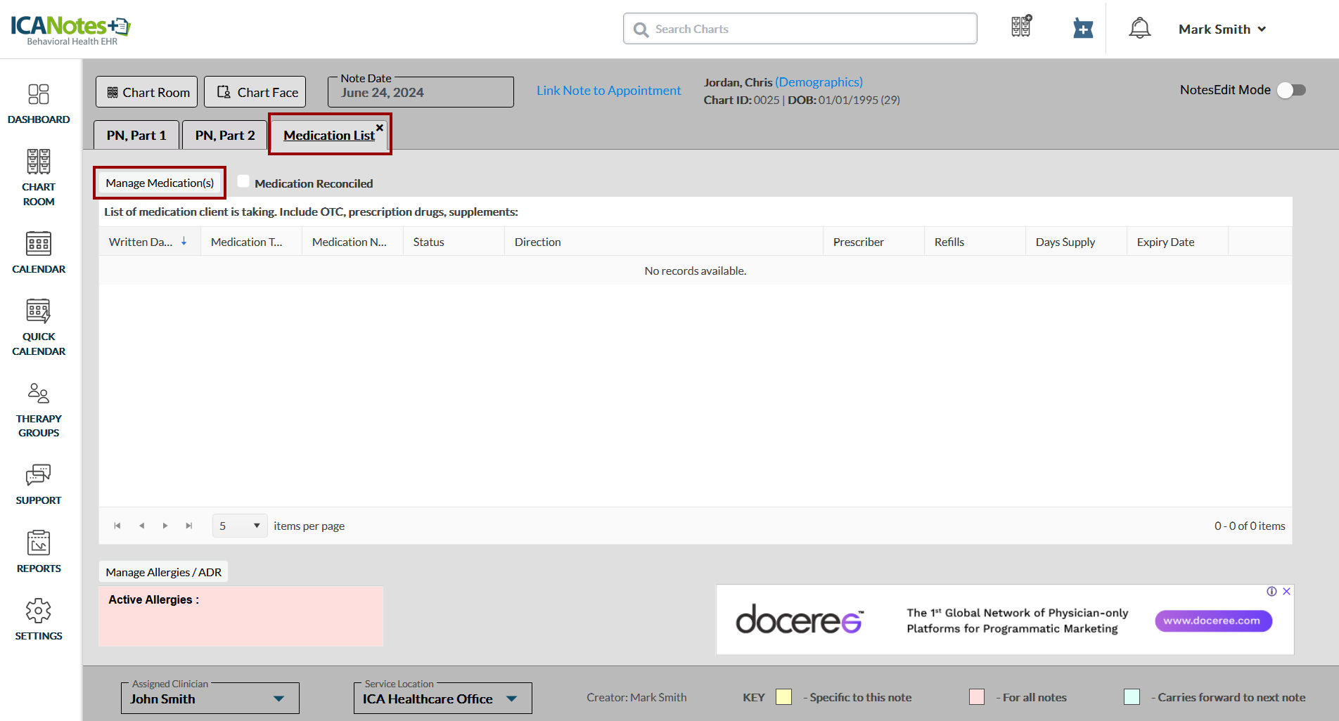 2. Access the client's chart > open a note and navigate to the Manage Medication List tab.