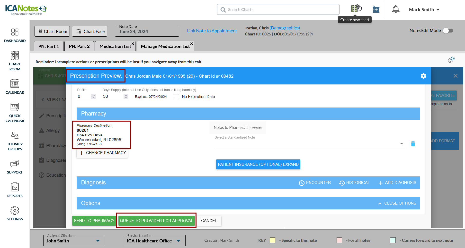Once you have the drug details, select the pharmacy to send the prescription. If the pharmacy is not added for the client, add a pharmacy. Once you select the details, click the Queue to Provider for Approval button as shown below.