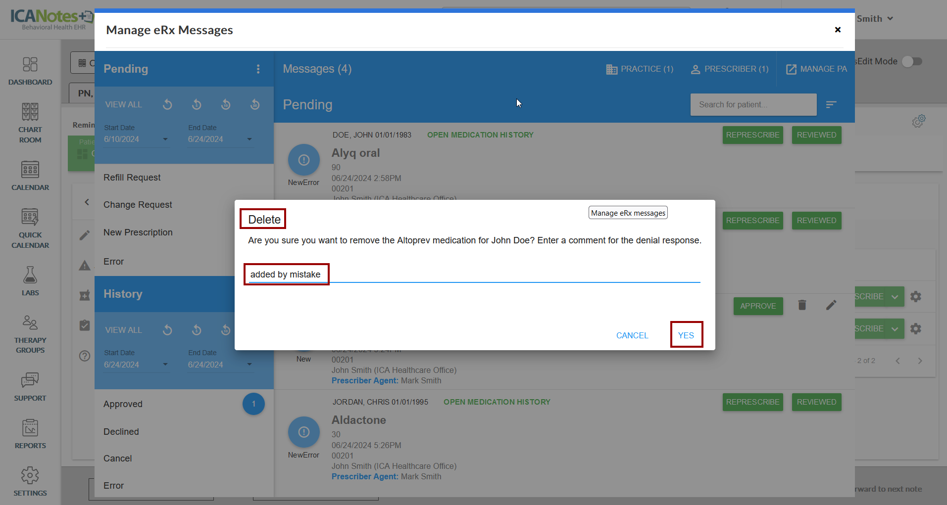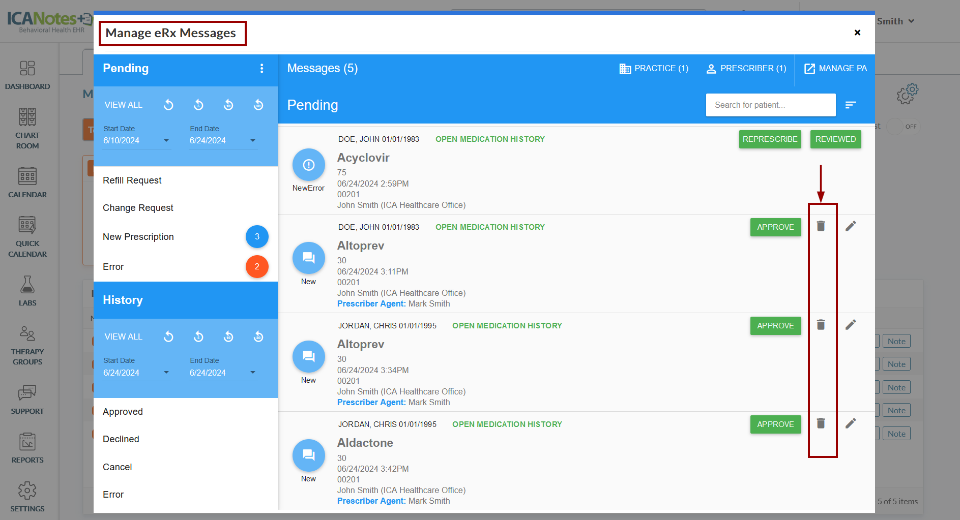 When you access the eRx Notifications for approving medication requests, locate the Delete icon as highlighted in the screen below: