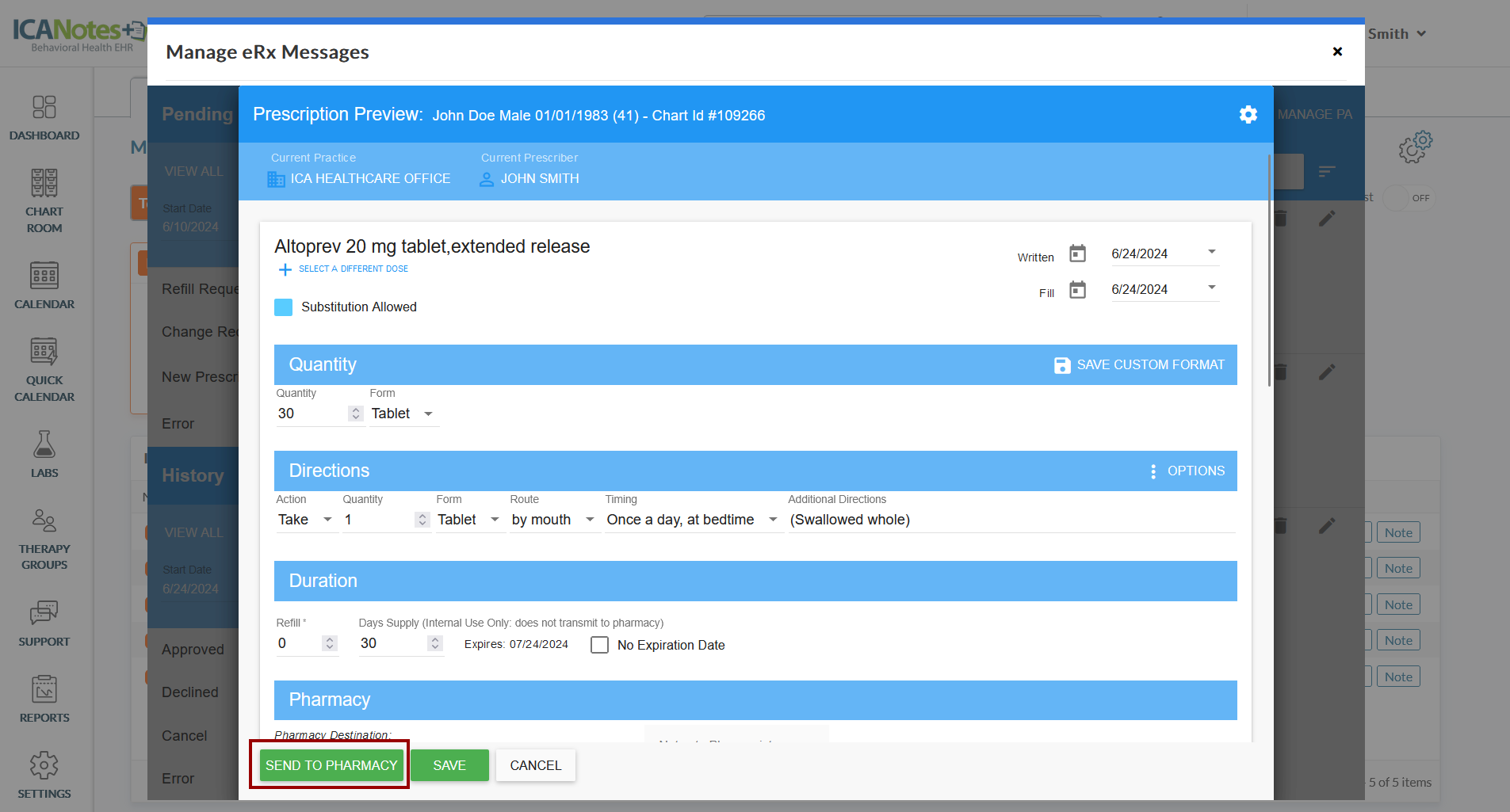 6. Clicking the Approve button opens the following screen. Review medication details and click the Send to Pharmacy button.