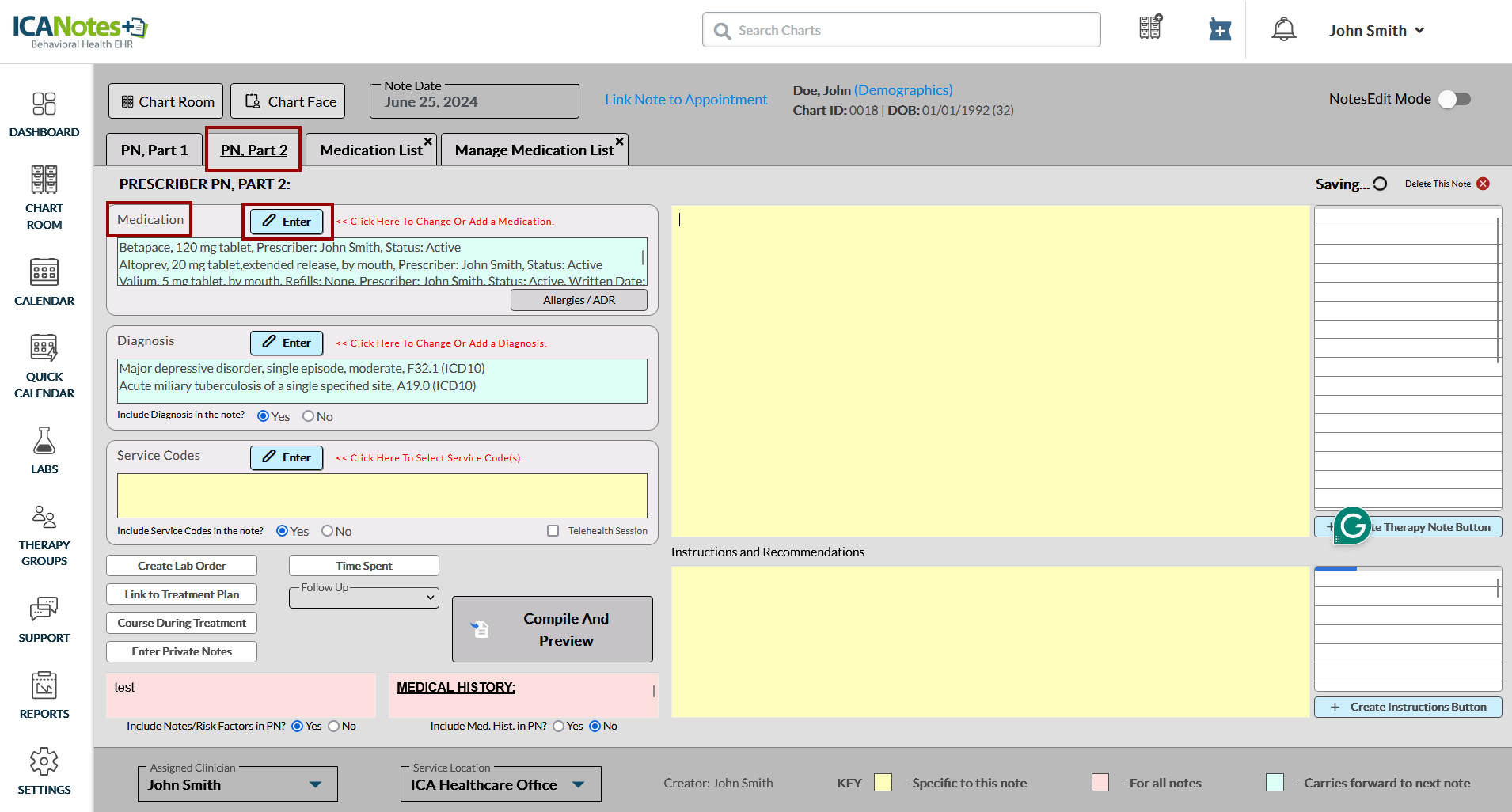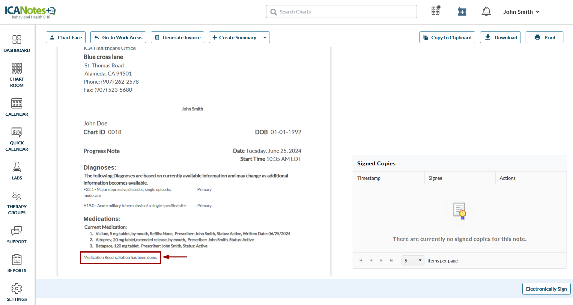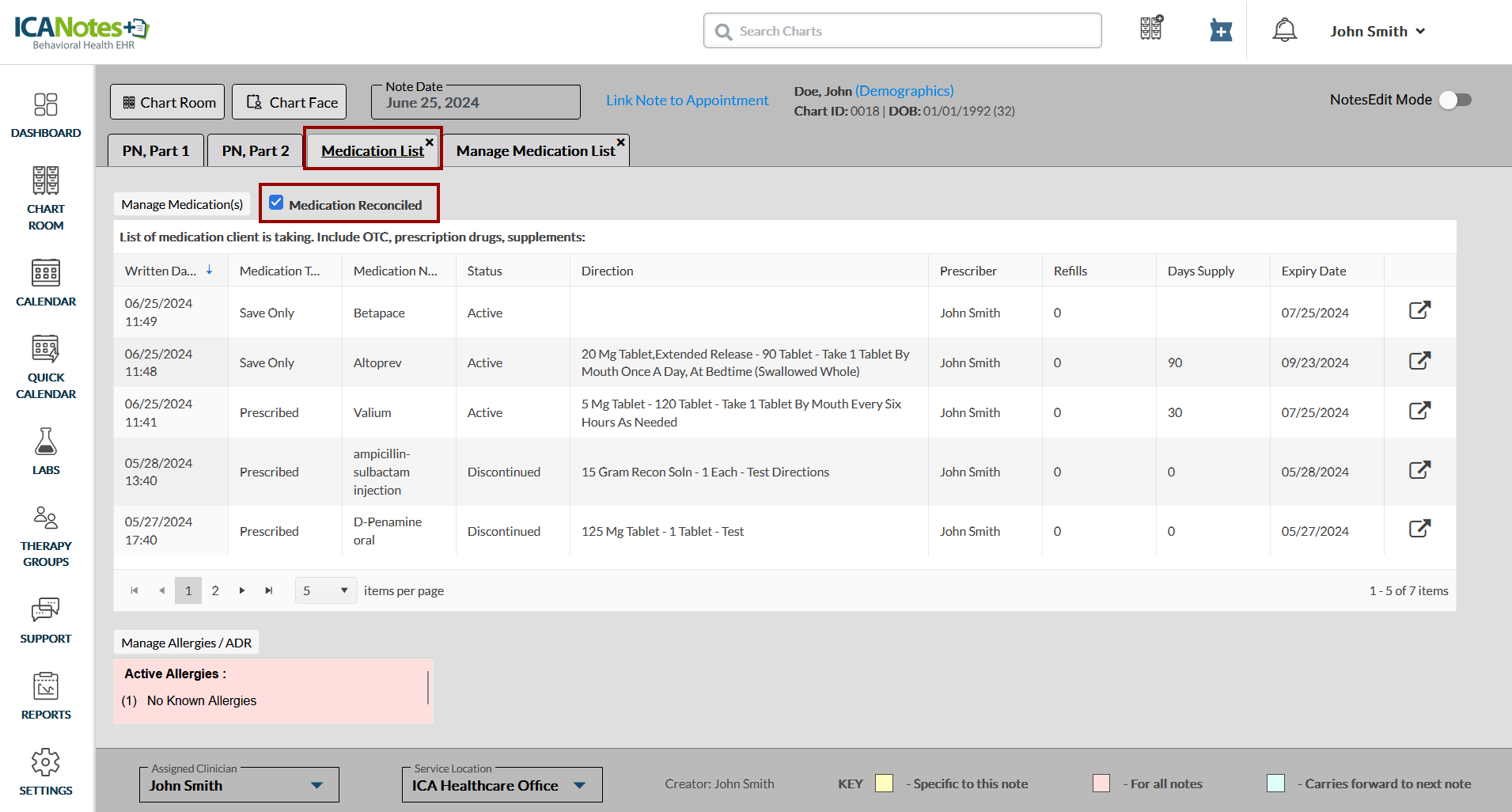 Medication reconciliation ensures that clients receive the correct medications at all points of care. ICANotes+ allows you to mark medications as reconciled, which will then appear on the compiled note.